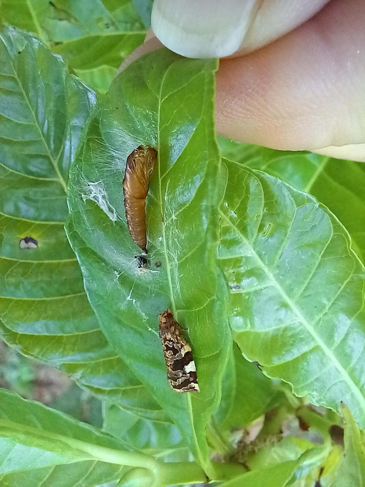 Observation notes: Sumter County, Florida, USA. Found this on a wild coffee plant (psychotria nervosa) in my yard, looked up bugs of which that's a host plant, but nothing matched that I could see. And is that the chrysalis it just came out of? Preliminary suggestion from someone on Facebook Antman's Hill group suggested Tortricidae.