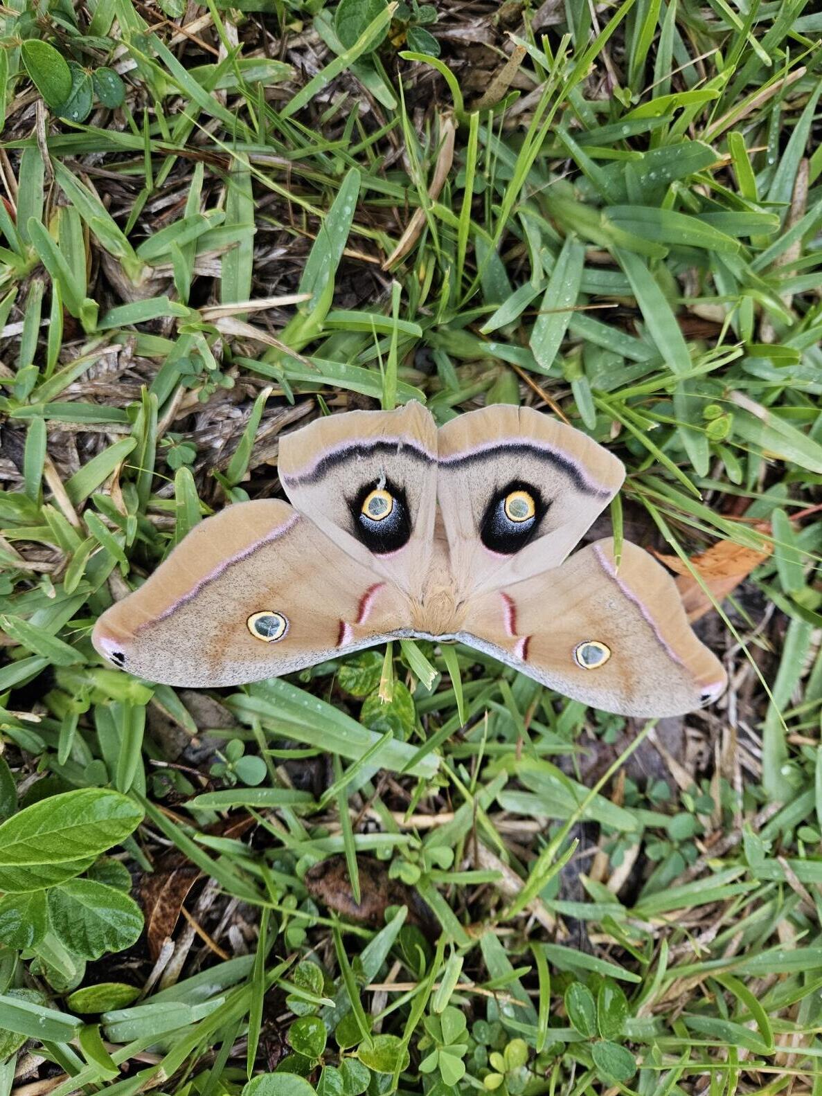 Observation notes: Two birds were around the Lo moth when I found it. It was in the grass in my back yard in Port St Lucie, FL