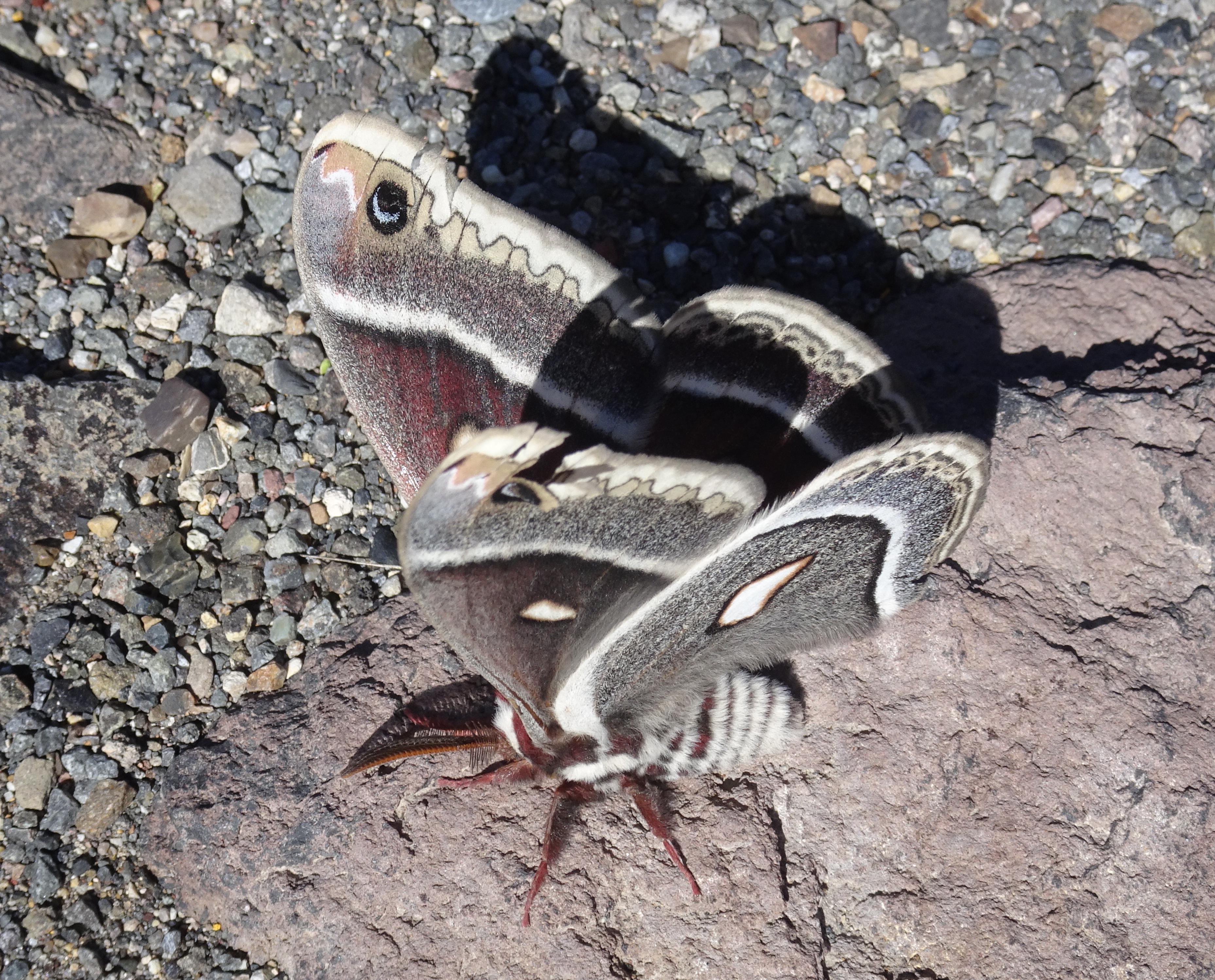 Observation notes: In a parking lot in Eureka, Nevada. It initially wasn't moving, but when I put a stick under its feet to move it out of the way of cars, then it held onto the stick and started to slowly flap its wings. Weather was sunny and was warming up after having been cold overnight.