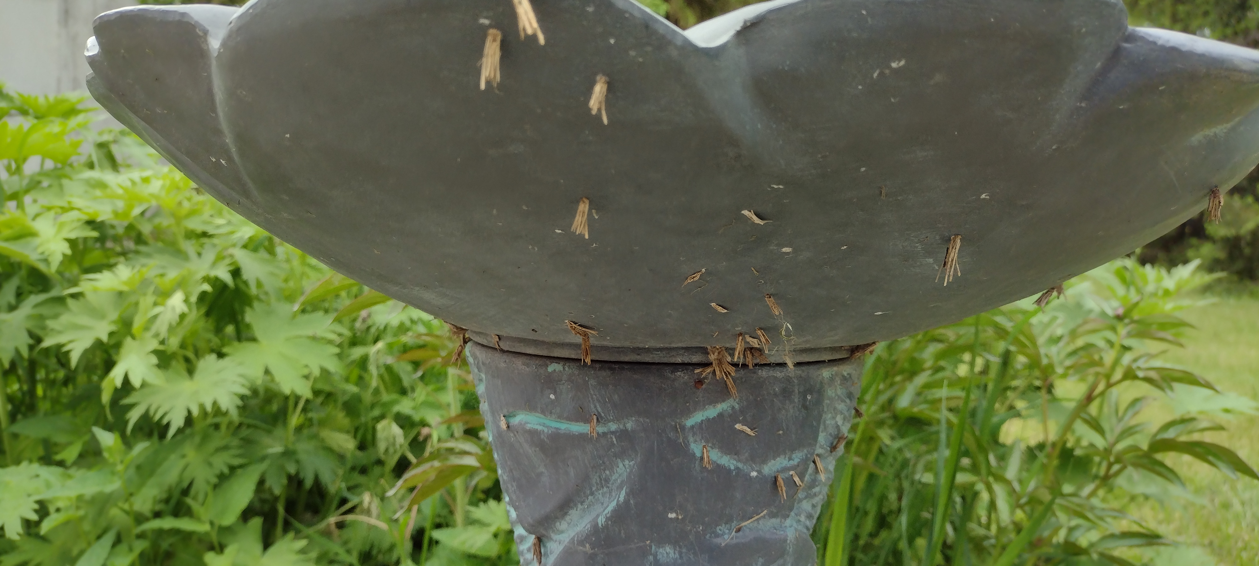 Date notes: I first noticed these this year about a week or so ago. They are not only attached to the side of the bird bath but also on the lower side of my house in the backyard.