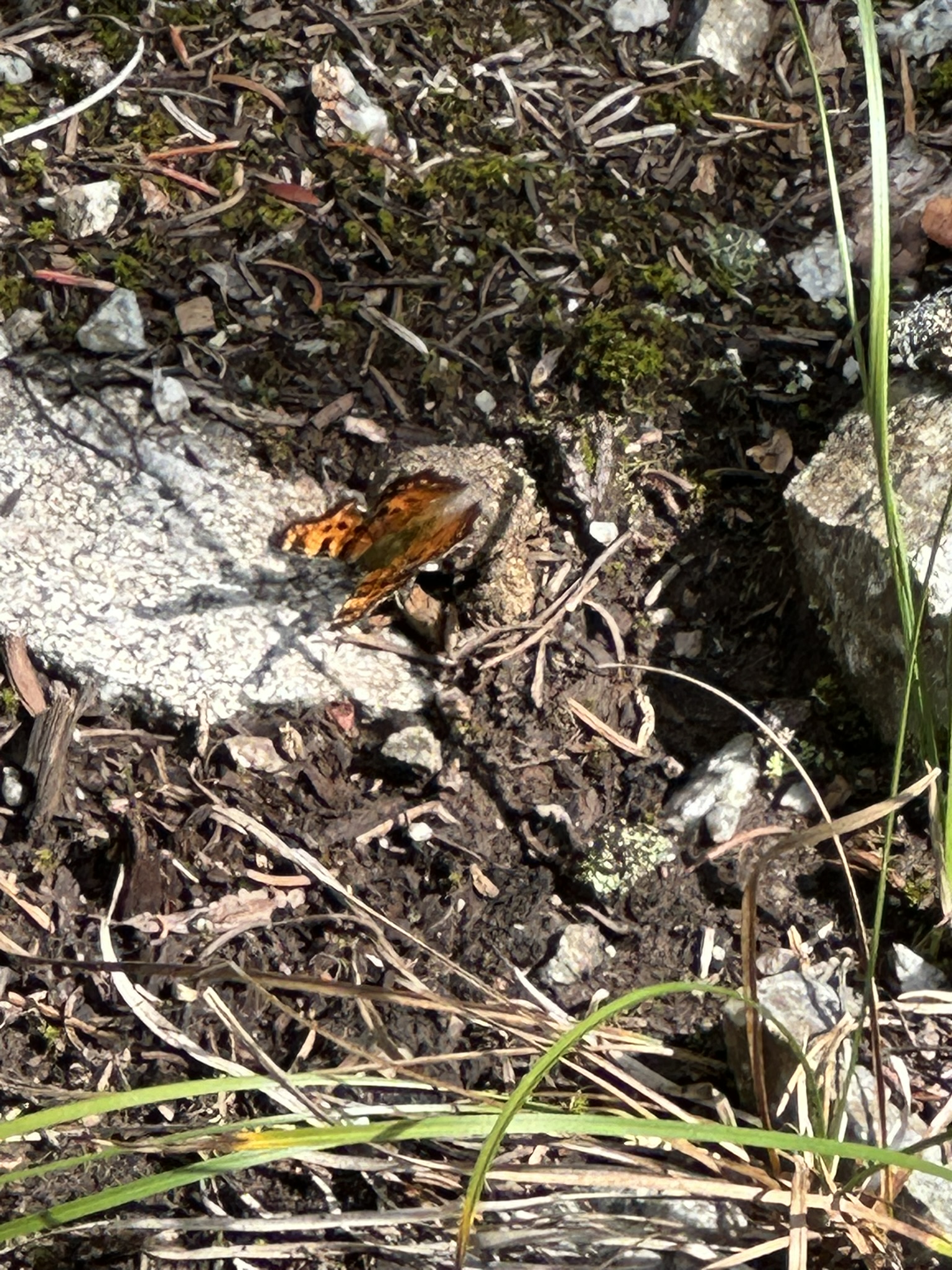 Coordinator notes: Green Comma...in the mountains, the only comma with the neatly formed spots on the upper hindwings entirely within the dark wing border (the underside mottled in pattern, much more than the Hoary and not brown like the Satyr). Mike