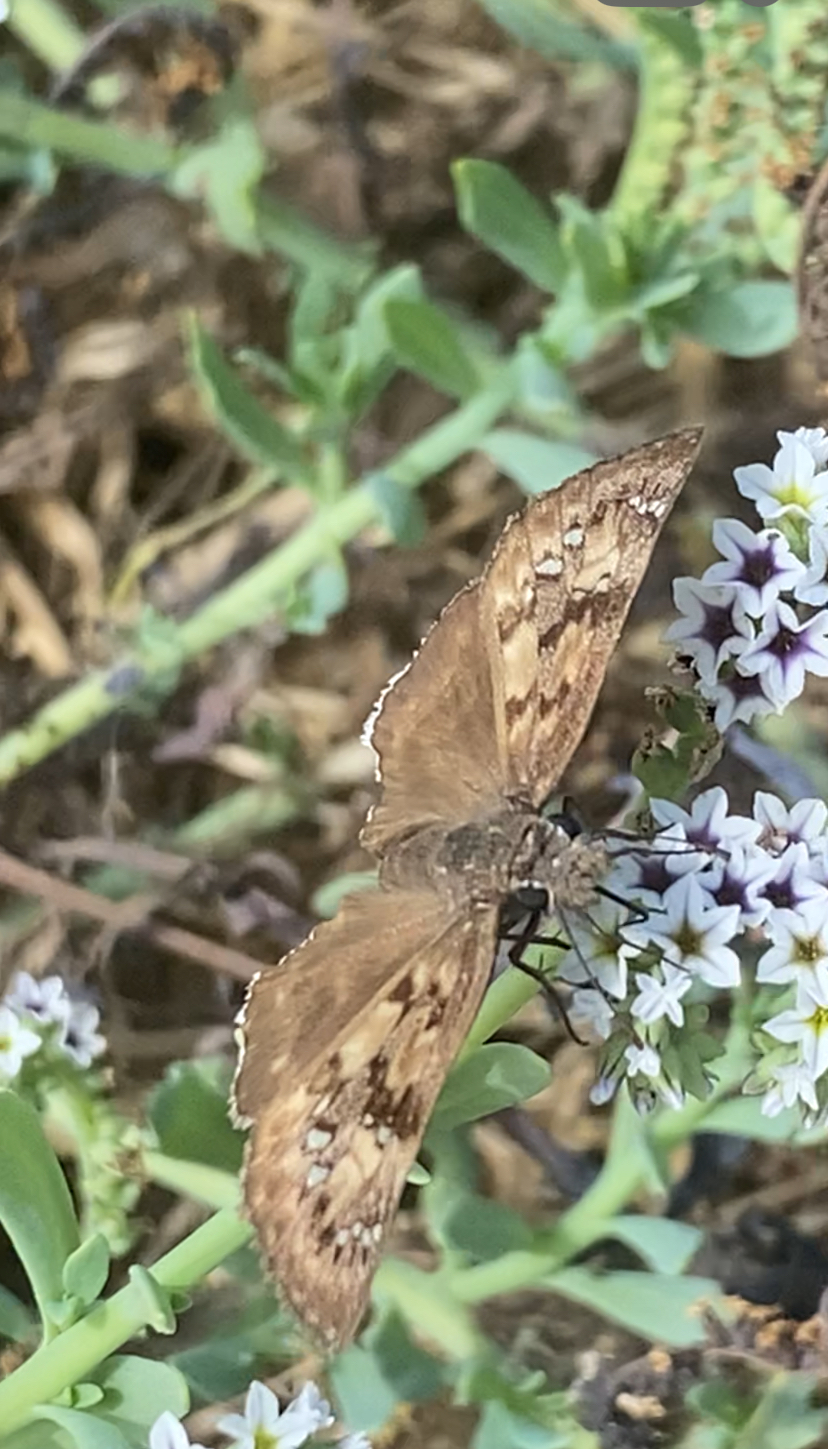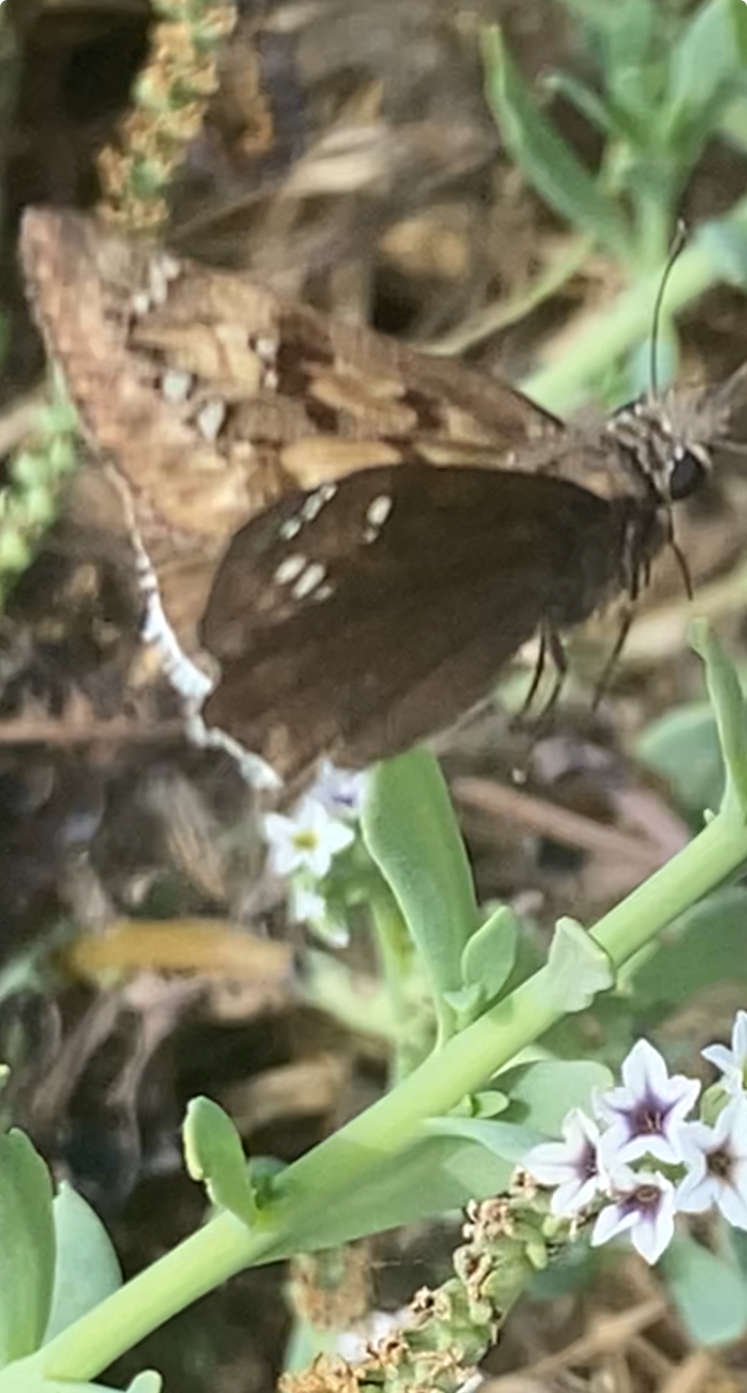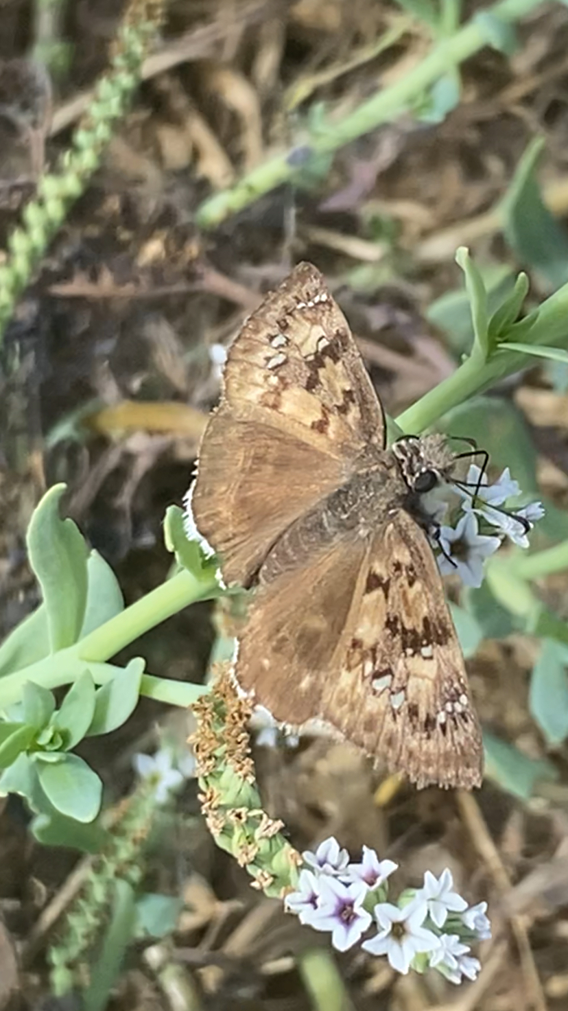 Observation notes: Lone individual hanging around a cluster of healthy Heliotrope in the company of Mallow Scrub and Gray Hairstreaks, White Checkered Skippers and other Skippers. Largely ignored my photography as it made short hops from flower to flower. Not territorial. Weather fair, with afternoon fog closing in.