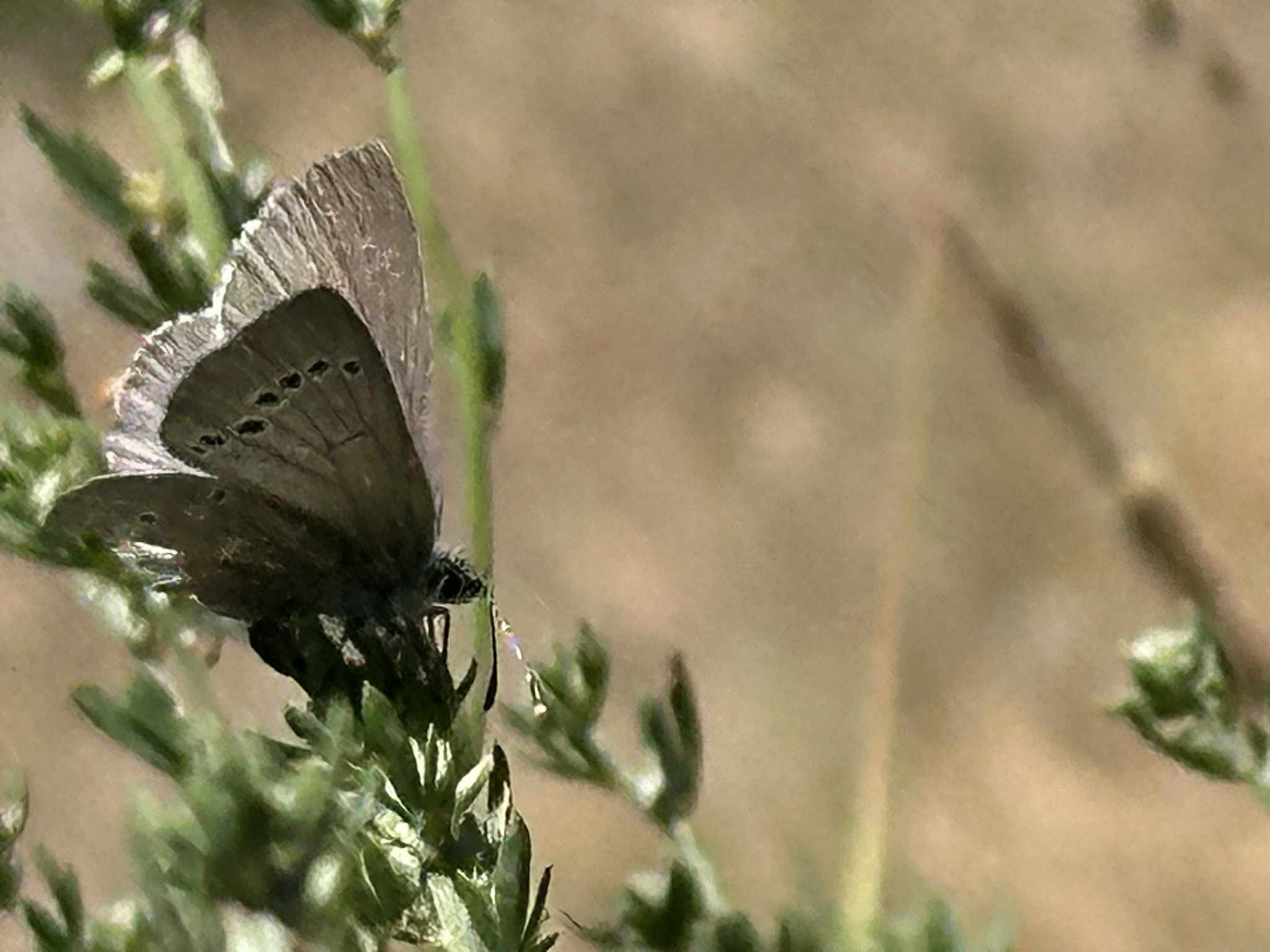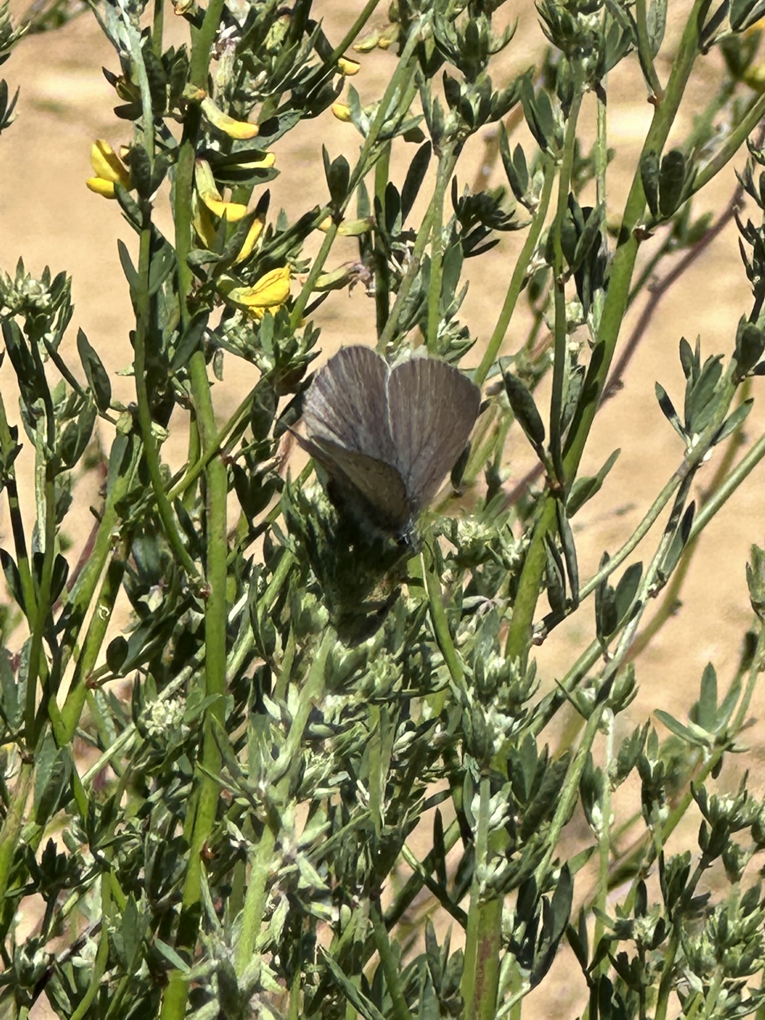Observation notes: Near Gaviota Peak fire road. Sunny day in the 70’s F. Very faded late season Silvery Blue on one of its host plants Deerweed.