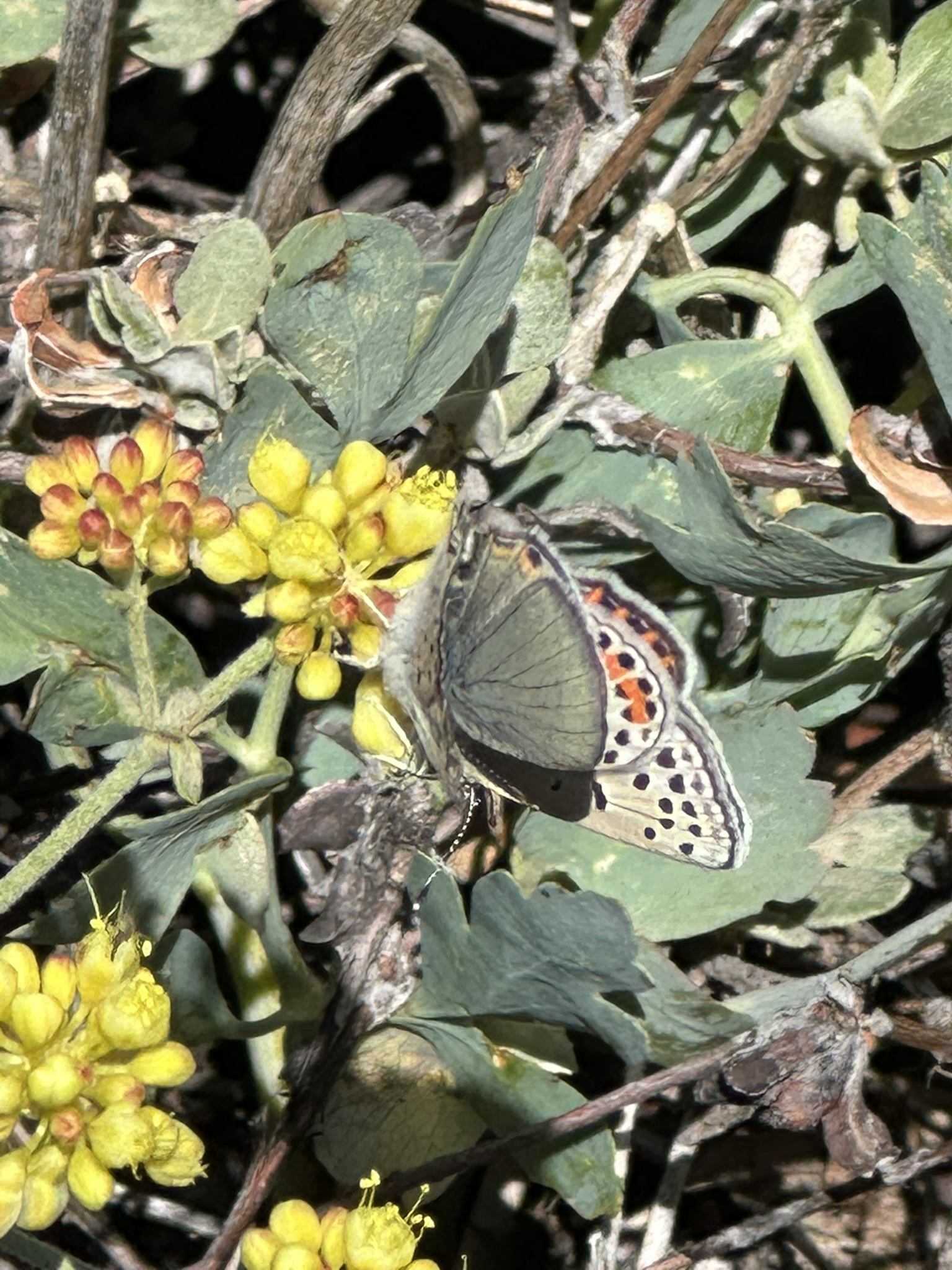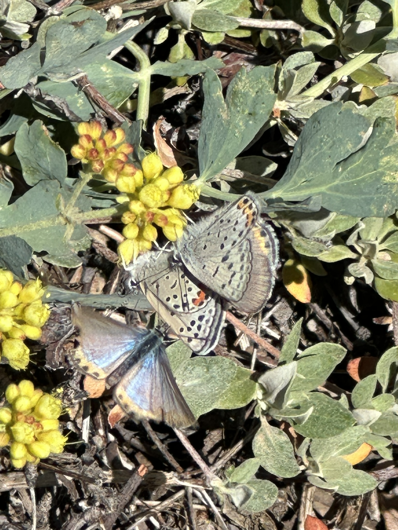 Observation notes: On patch of Sulphur Buckwheat on NW face of San Rafael Mountain between 5500 and 6500 ft elevation. Sunny day in the 70’s F. These look similar to the ones on Mt Pinos. Swarms of these as well as probable Euphilotes glaucon on every small or large Sulphur Buckwheat patch on the mountain. Might be new records for Santa Barbara County. 2 Males chasing perched female.
