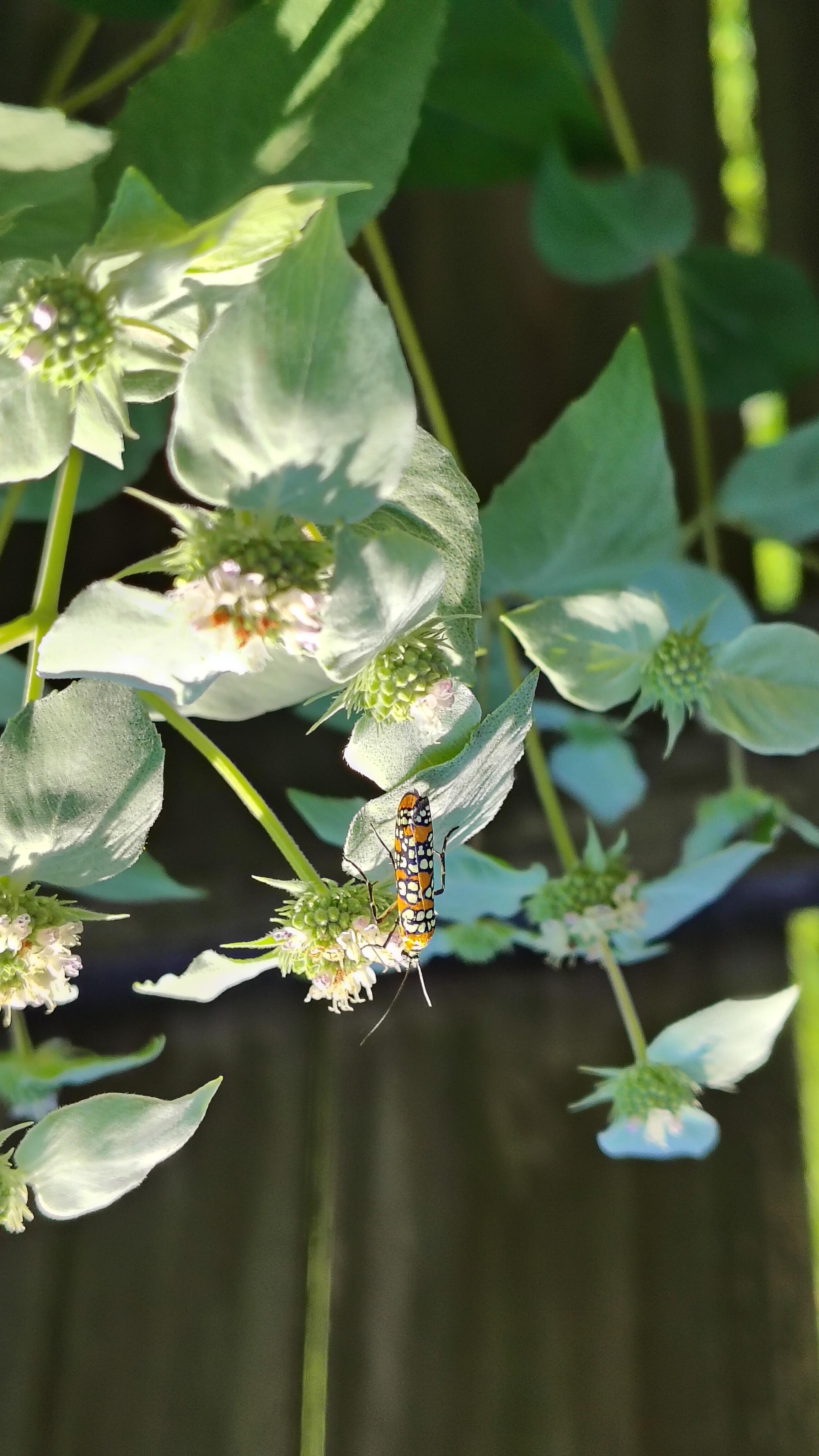 Observation notes: Sunny, warm morning. The moth was enjoying the blooms of mountain mint with the other pollinators