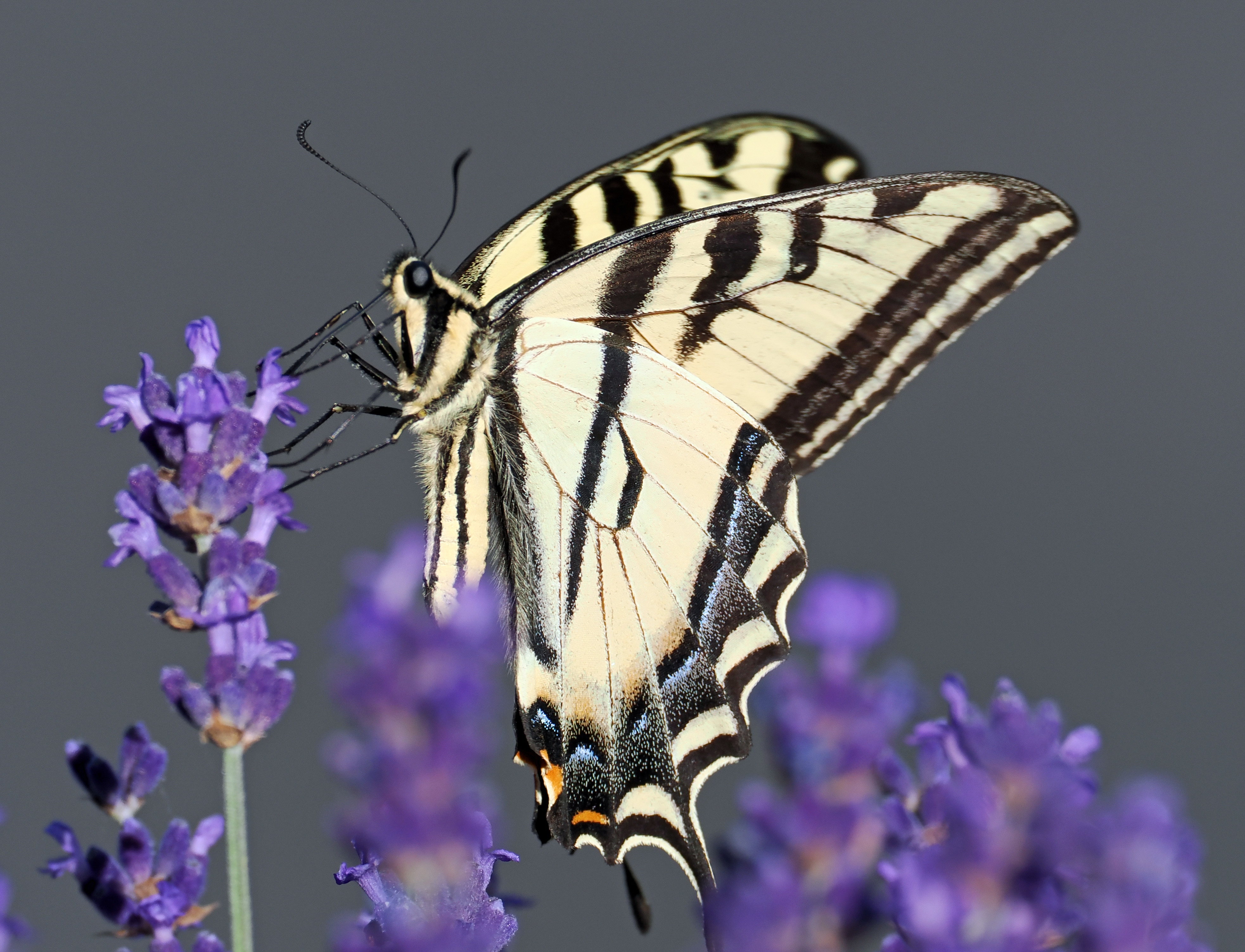 Observation notes: This lone Swallowtail was feeding at our lavender flowers for about 10 minutes, then flew off. While it was feeding, it rapidly fluttered its wings. Weather was warm & sunny.