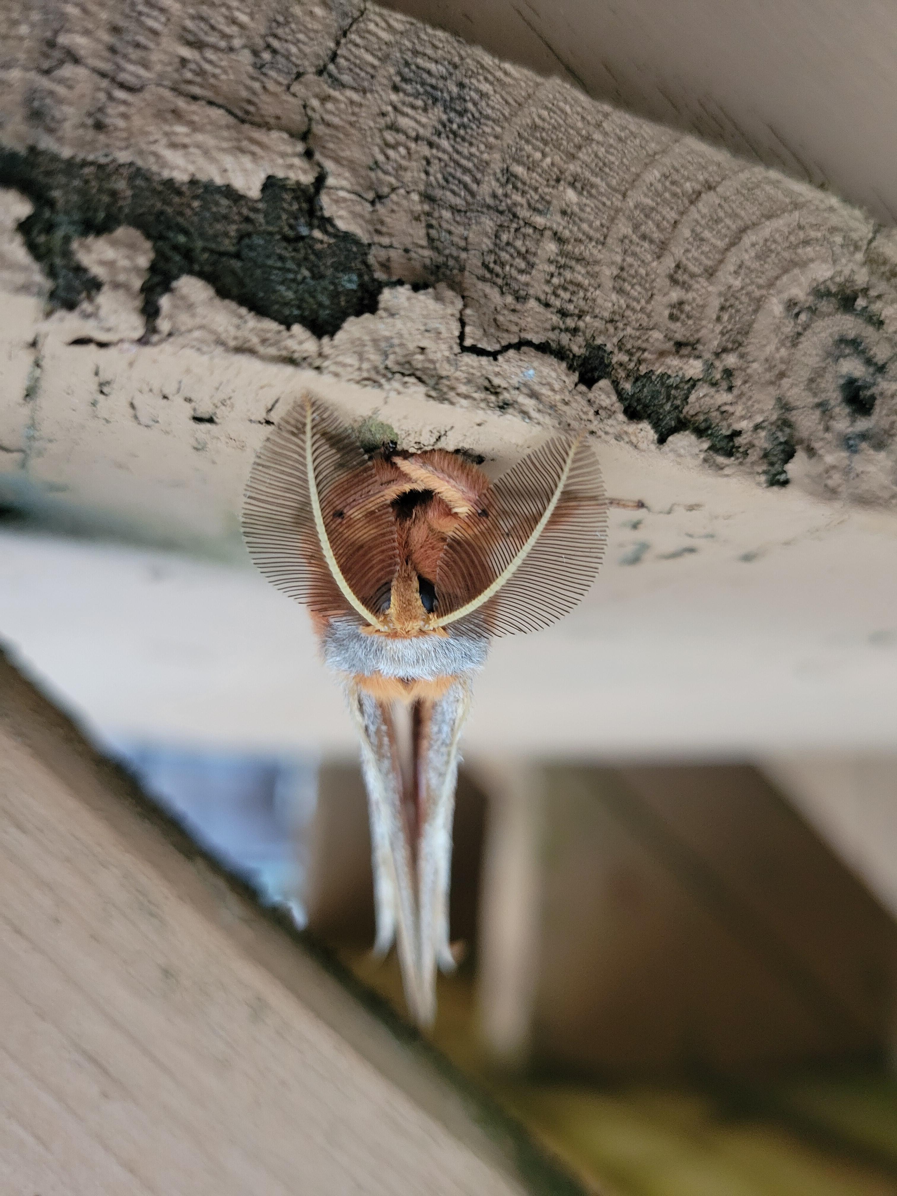 Observation notes: for a brief maybe week long period i seen 8 of these, its the first time i seen one let alone so many here in NL. quite large compared to the regular species, very fluffy antanae. this one seemed to be resting as it was still a bit light out.