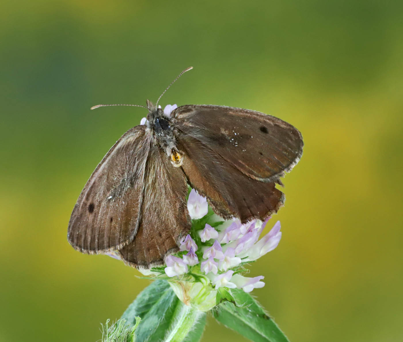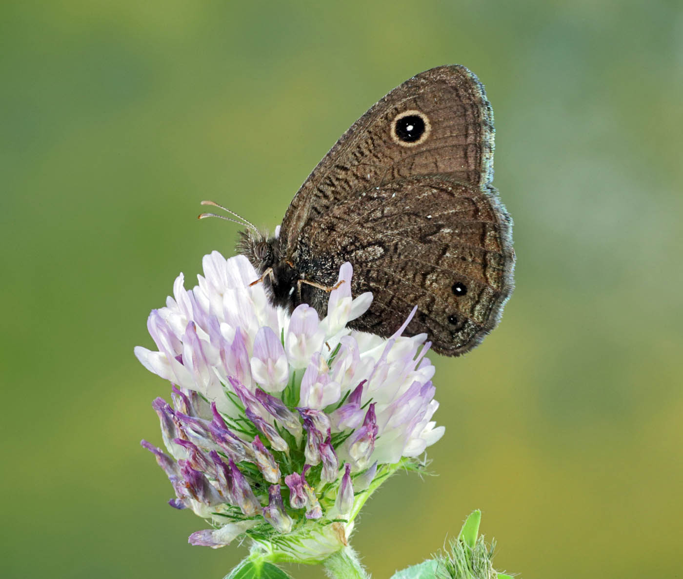 Observation notes: I think this is a dark wood nymph, Cercyonis oetus, because the lower eyespot on the forewing (which is not showing in the photo) is much smaller than the upper spot and doesn't have a white dot in the center. It was also much smaller than the common or great basin wood nymph.