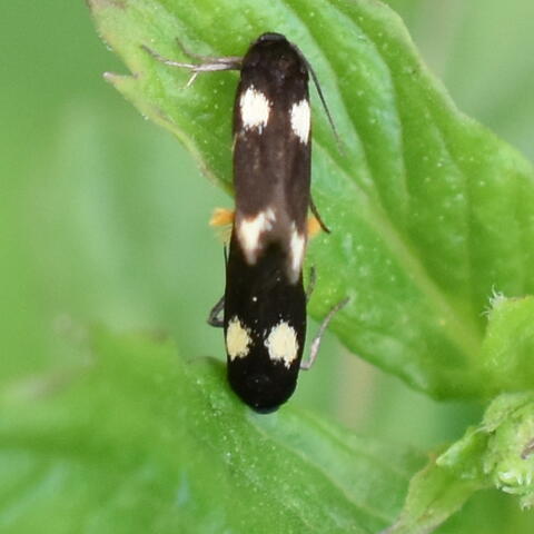 Observation notes: Noticed sitting on a spearmint leaf. Spots looked more yellow in real life. I didn't realize until I enlarged the photo that there are two moths there.