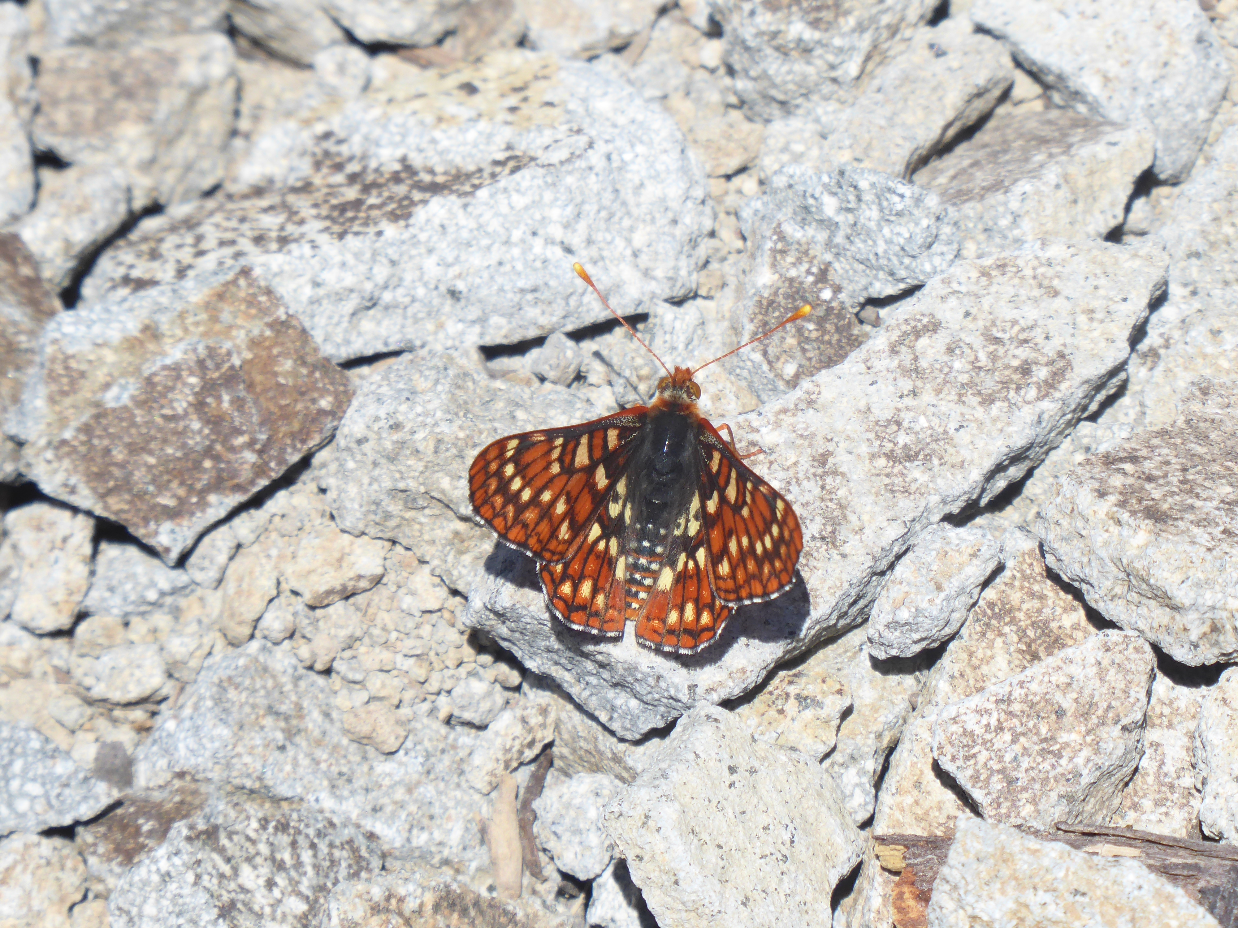 Coordinator notes: Subspecies sierra. What identification clue? The spots on the abdomen can separate these from Edith's Checkerspot.-Ken Davenport