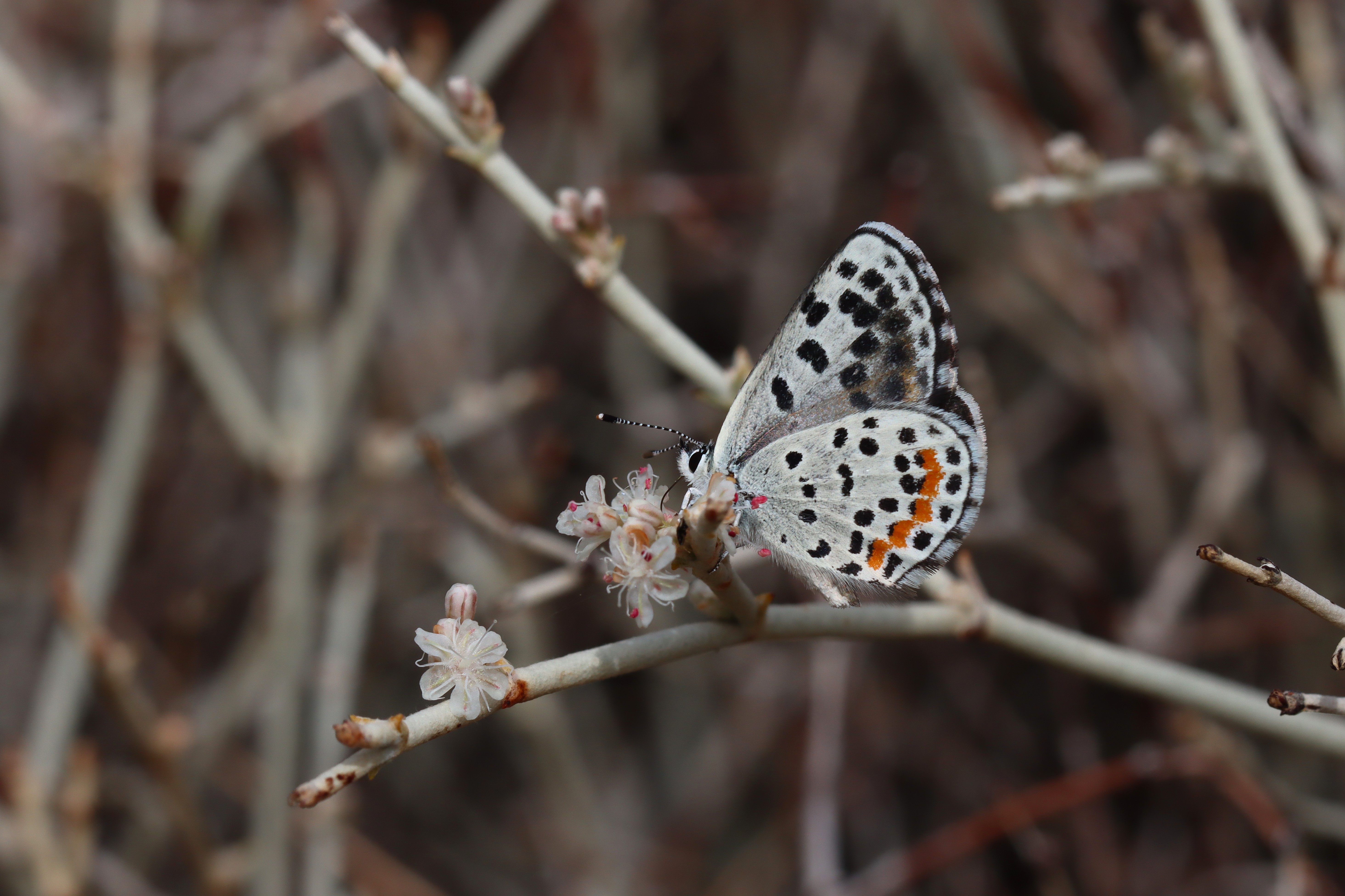 Observation notes: Found in two locations on the Cactus Spring Trail in the Santa Rosa Wilderness, Riverside County, CA. The first was at a small trickling stream and the second was in a patch of Eriogonum wrightii.