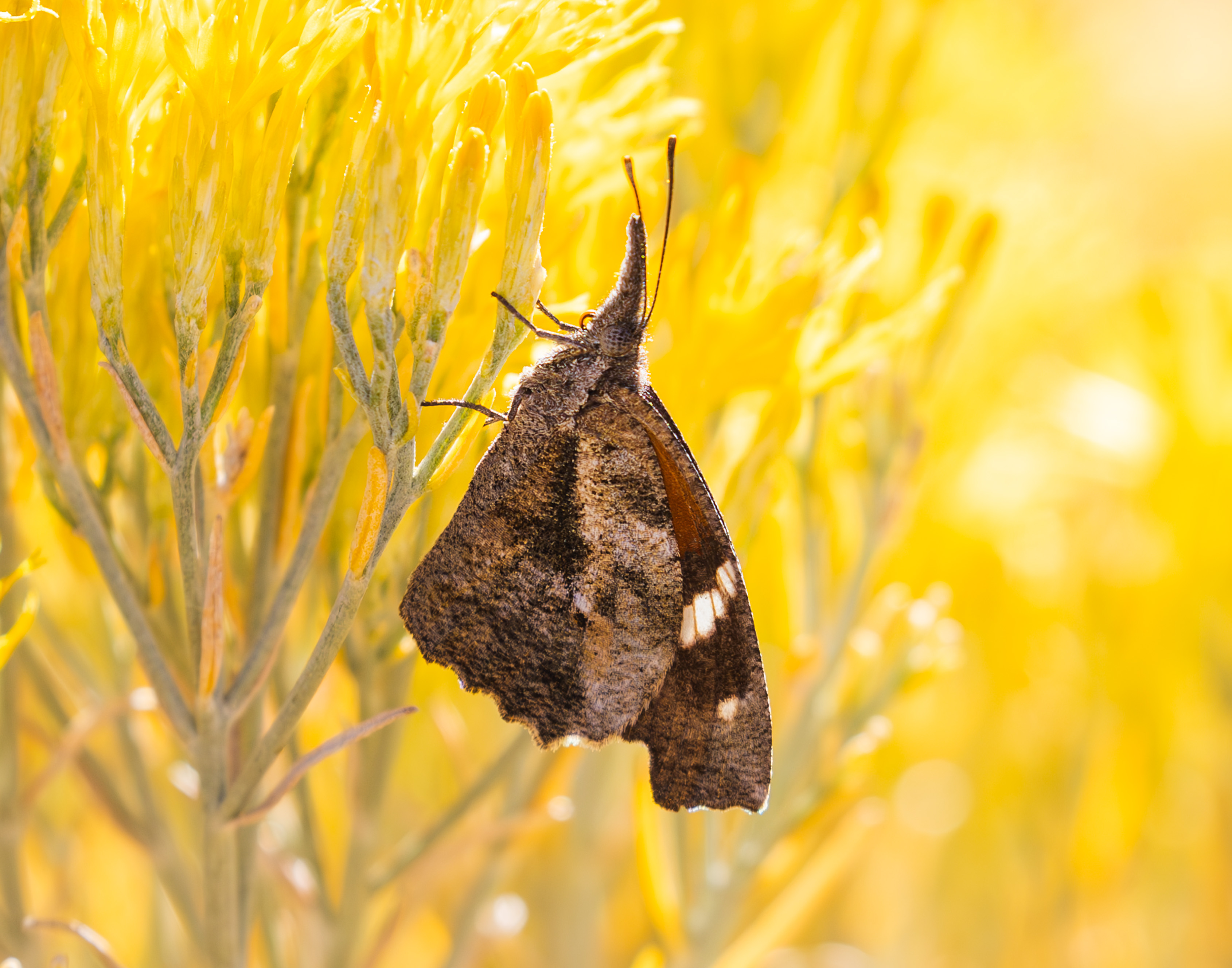 Observation notes: Unusually warm stretch of weather. Sunny, very little wind temp in upper 60s F. These little guys are having an exceptional fall in this area! A couple seen nectaring on the few late blooms of chamisa in downtown Los Alamos. A lot more seen along Trinity Drive.