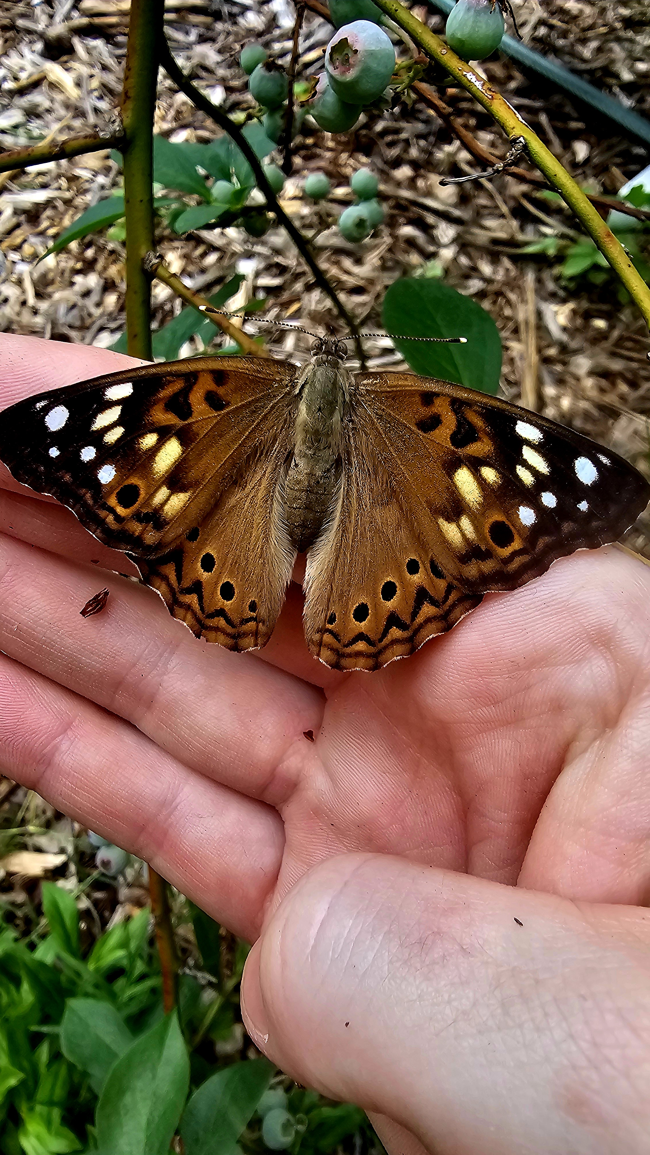Observation notes: Crawled onto my hand and stayed with me for roughly 15 minutes before flying away.