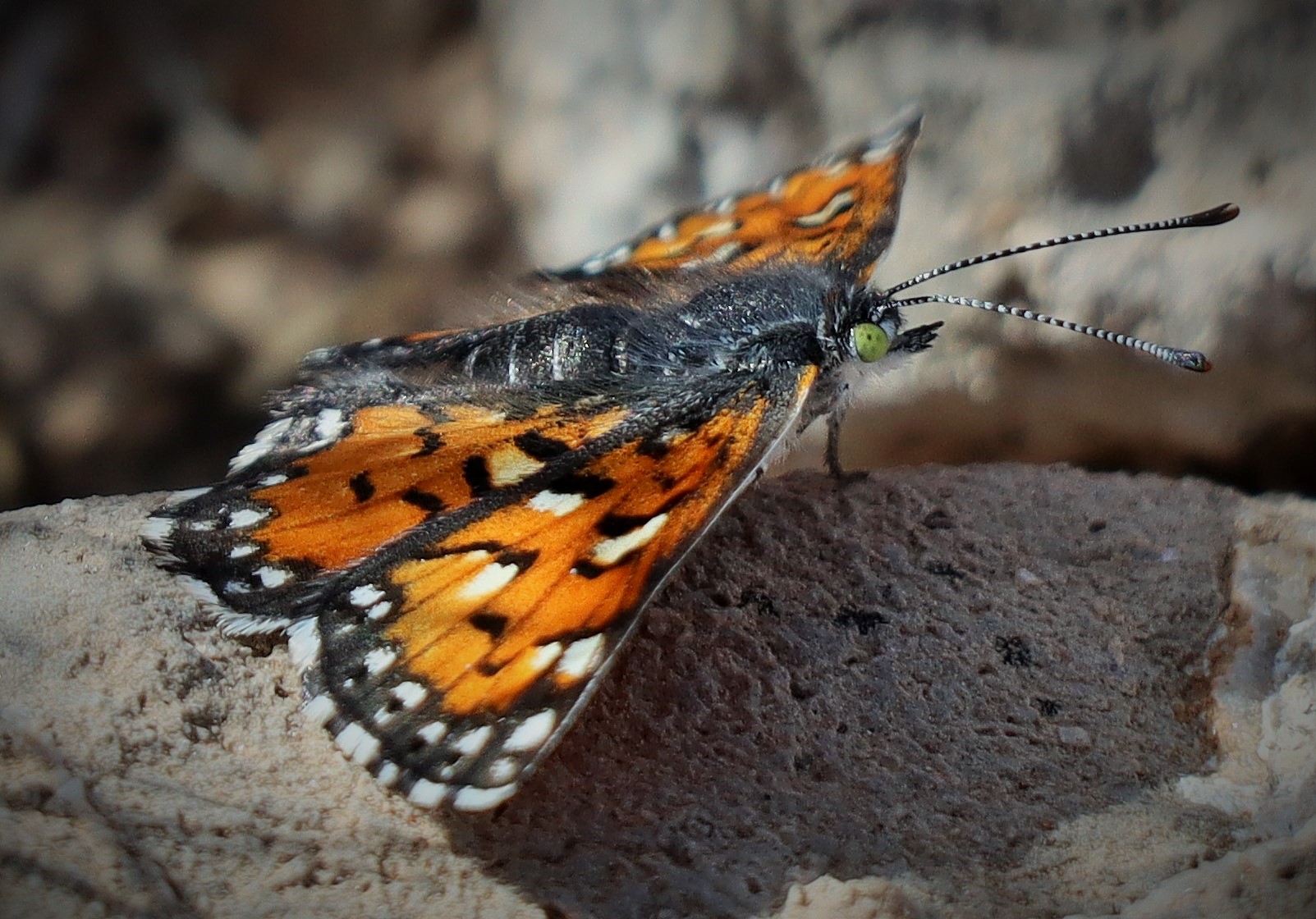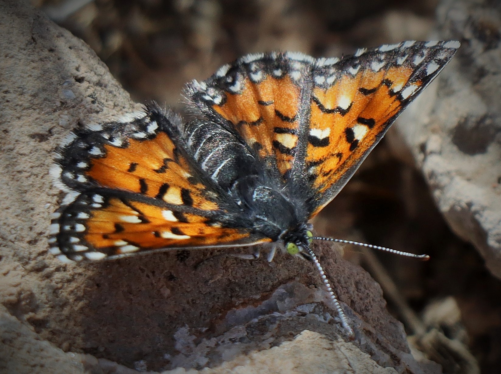 Observation notes: With warm temperature, this metalmark is appearing on the west-facing slope of Tortugas Mountain as well as at the east-facing type locality. This individual was sunning on a littleleaf ratany shrub and when disturbed flew into an adjacent tangle of dry grass stems then descended to a rock below to continue sunning on a flat rock. The mid-afternoon was sunny, warm, and with low to moderate wind.