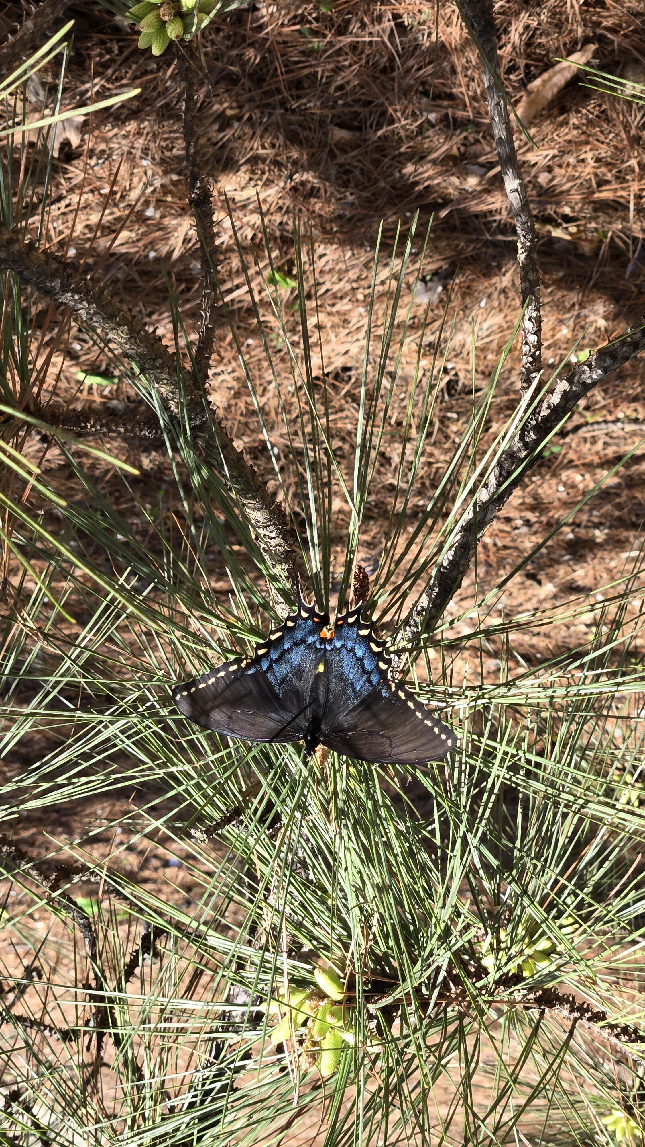 Observation notes: Cloudless, sunny day after several days of rain. Seen flitting from ground to tree to wooden fence (beige painted) near edge of pine woods. No blooms evident.