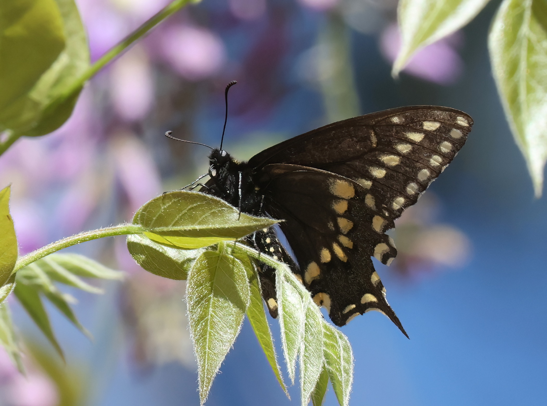 Coordinator notes: Or is it P. indra or P. bairdii? I wish there was a better view? Is prospect Park in the mountains?...Ken Davenport Or is it P. polyxenes rudkini form "clarki"? Based on the longer tails and locations, I am going with polyxenes, but the yellow band is similar to an indra.-Ken Davenport