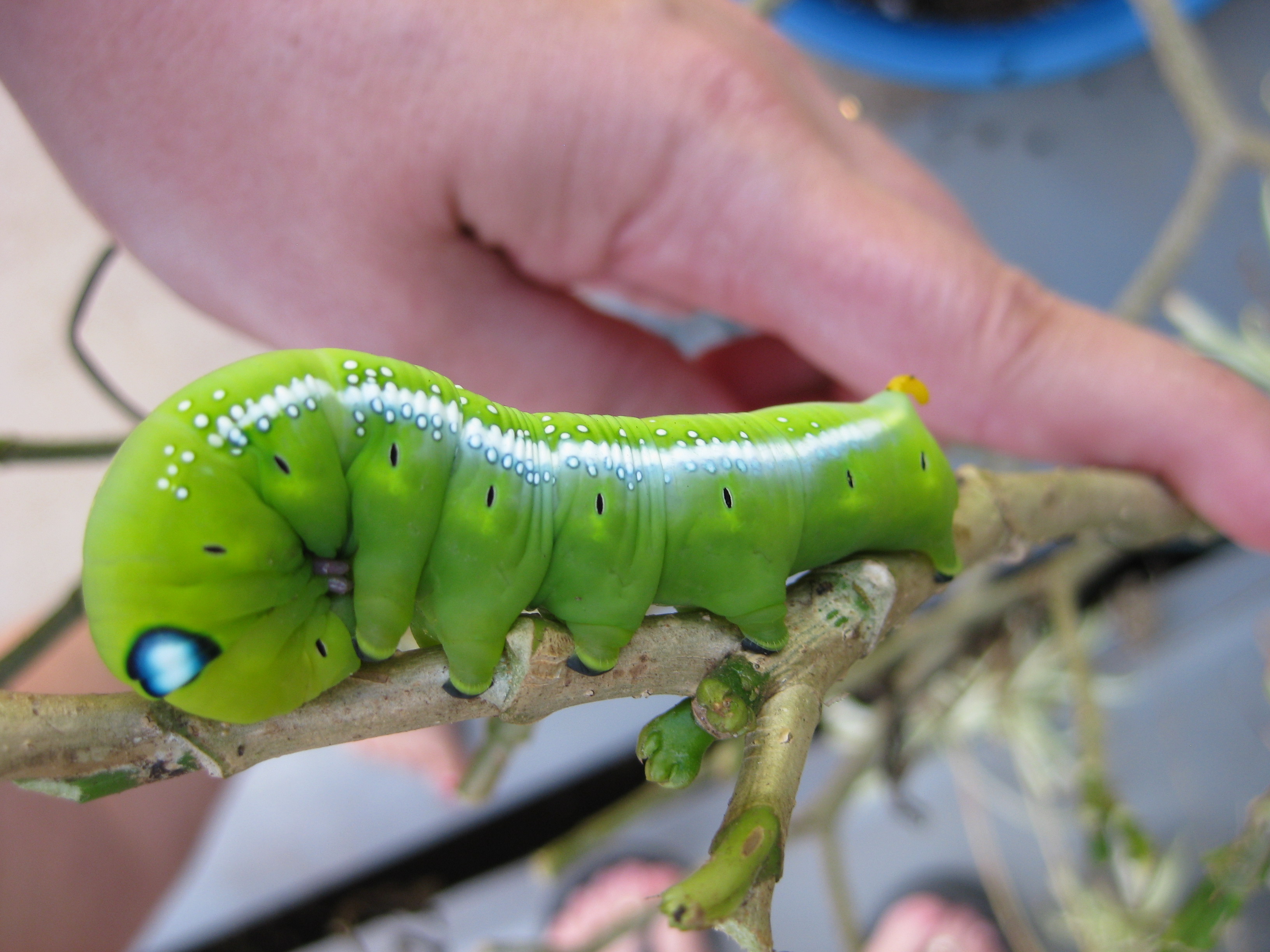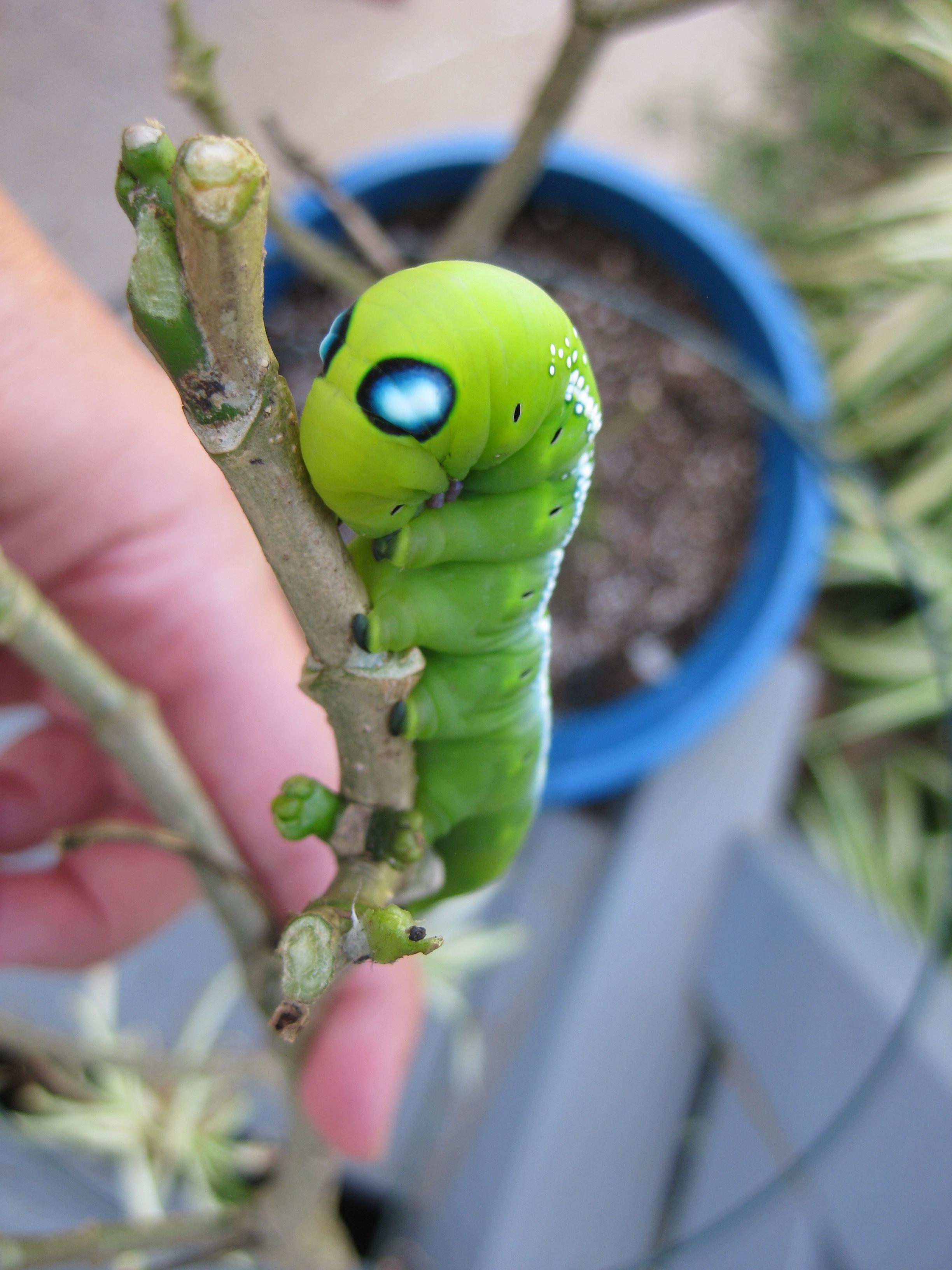 Observation notes: Location: Kihei, Maui, HI. Currently sunny, last 3 days were over-cast/light rains. Have three specimens in (what is left) of my gardenia plant. I believe they have also eaten some of my bouganvilla, but this is an assumption. Two on the plant are green with white spots. There is also a 3rd specimen - brown - laying on the potting soil. Not sure if the brown caterpillar is alive or dead, haven't seen it move, but the other two haven't moved much. I will continue to watch them.