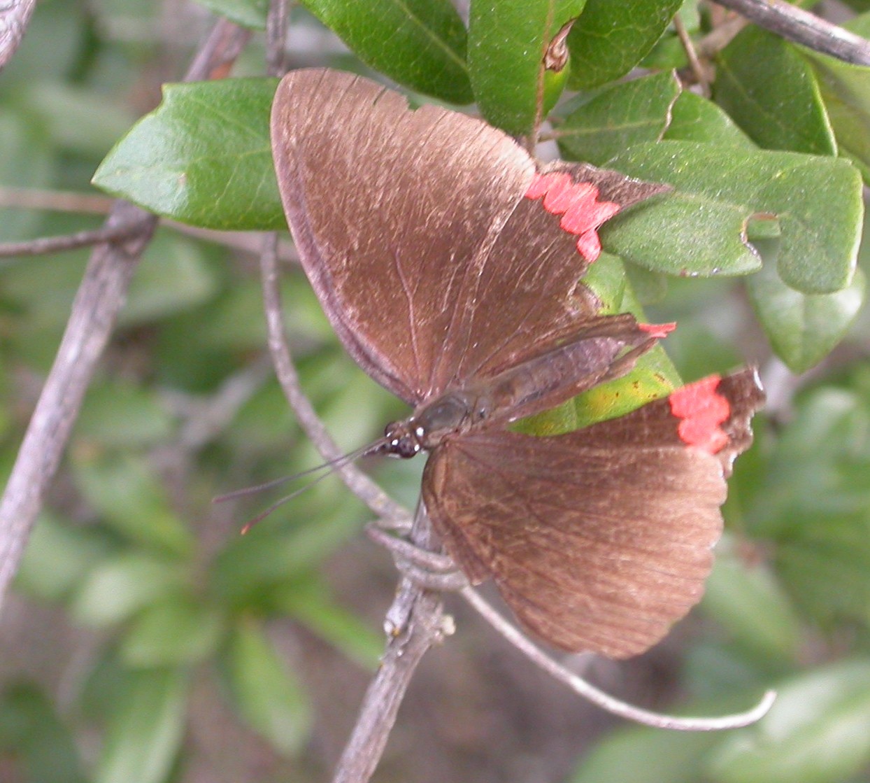 Observation notes: It was mid-afternoon when I got a short view of this butterfly working thought the ranch shrubs. After a few minutes of searching, I discover this really beaten up Red Rim hanging from a Live Oak. I took several pictures, but these two are the best.
