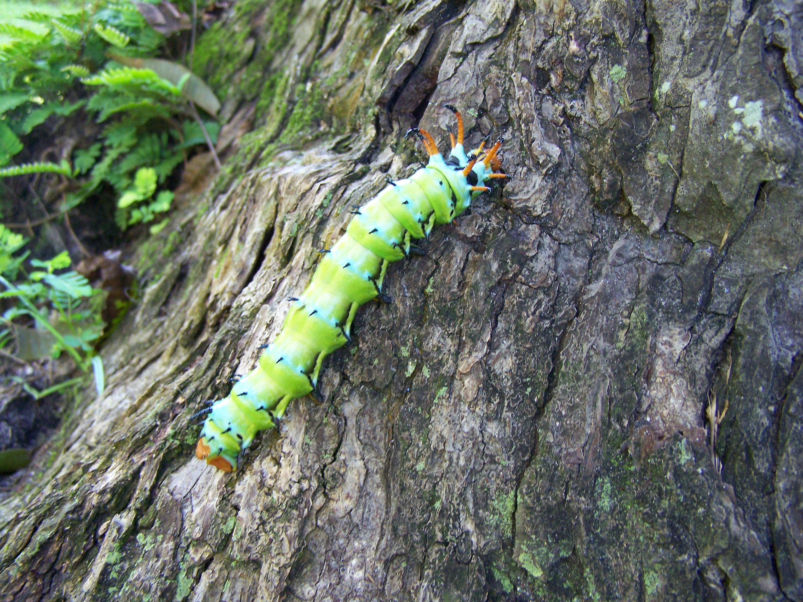 Observation notes: This caterpillar was at least 6 inches long and an inch in diameter. It's head and body are horned. Was climbing from the ground up the trunk of a pecan tree. Fair weather but flooding in the area.