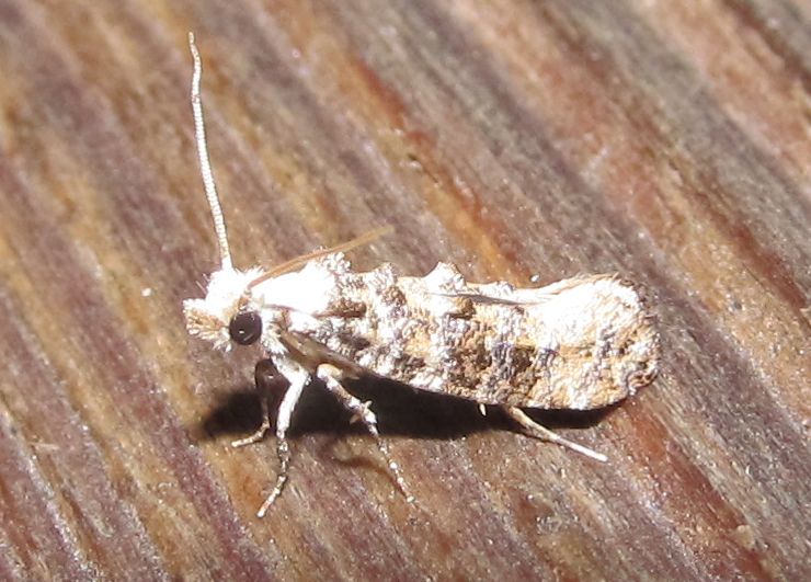Observation notes: Tiny little moth (about 1 cm long), bumpy texture, mostly white with brown spots