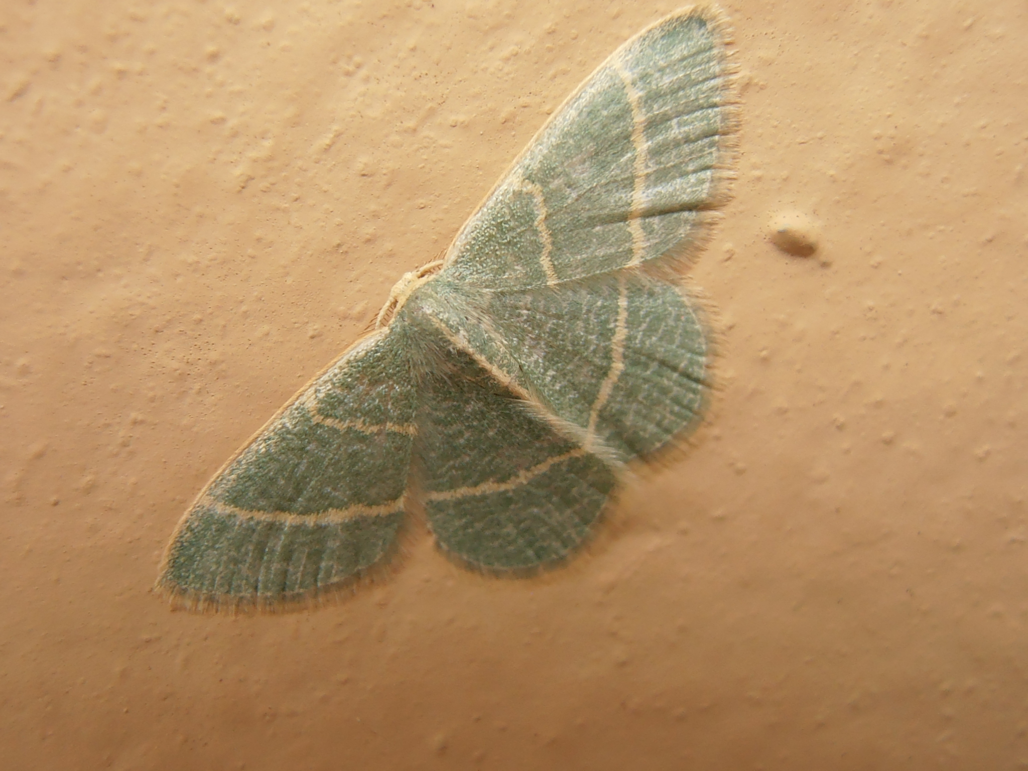 Observation notes: on our house on the east side of Colo. Springs, CO; under a flood light that had been on all night. Color of house is a light yellow tan, and the moth color was actually light turquoise green the upper wing was 1" across and there appears to be a fringe around the wing edges. It drizzled most of the night before, we have been having a monsoon season here lately.