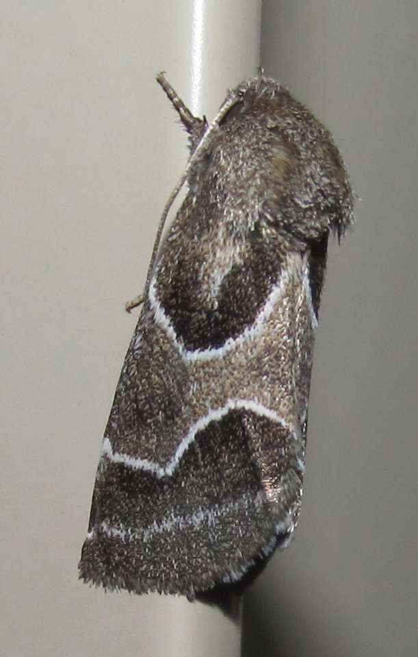 Observation notes: Banded moth, grays and black outlined with white lines, holds wings close to body, furry head, about 1 inch long