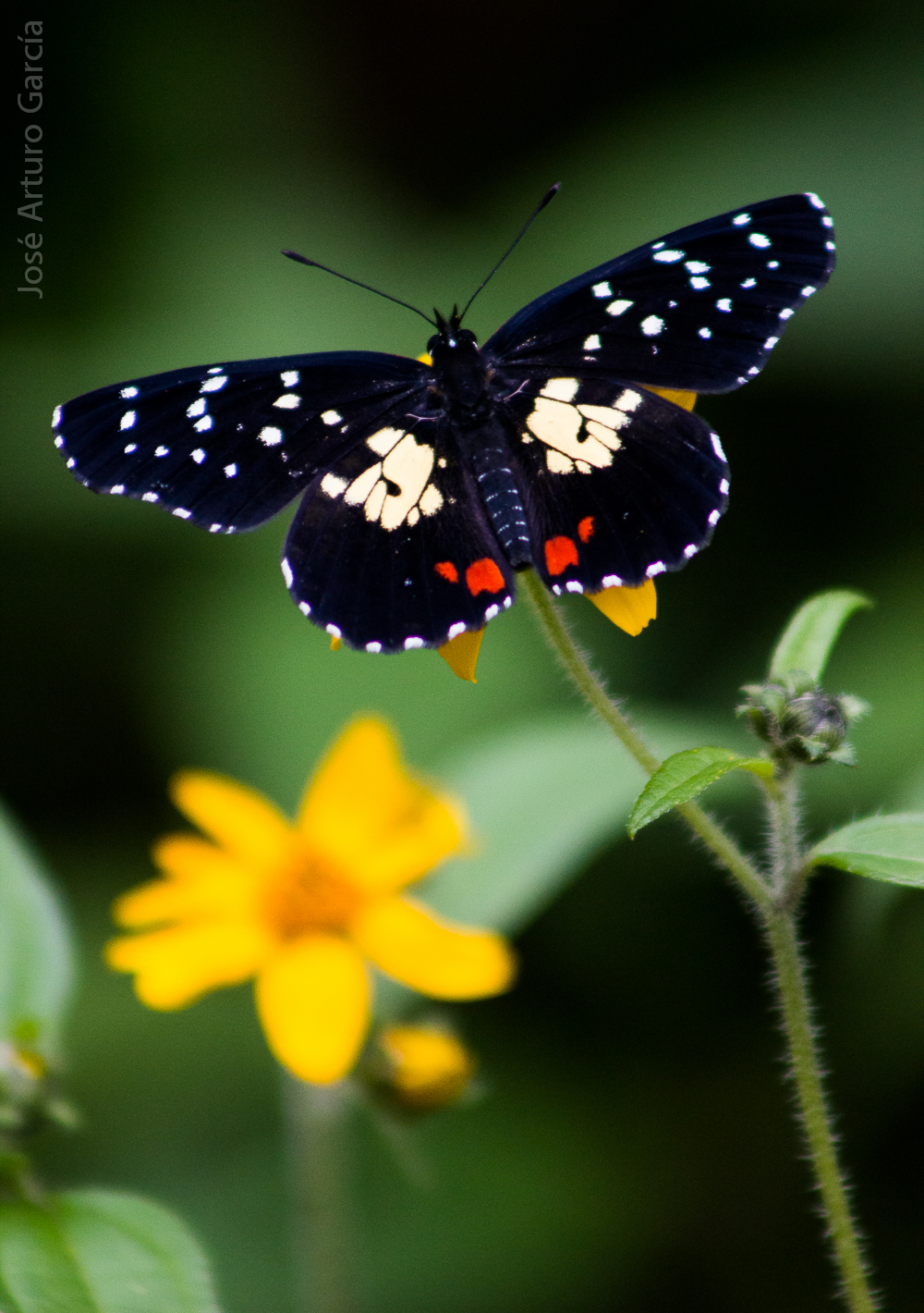 Observation notes: There were some three or four of these guys, hanging out with 10 or 12 Chlosyne janais, foraging in the same plant. Fresh and sunny conditions.