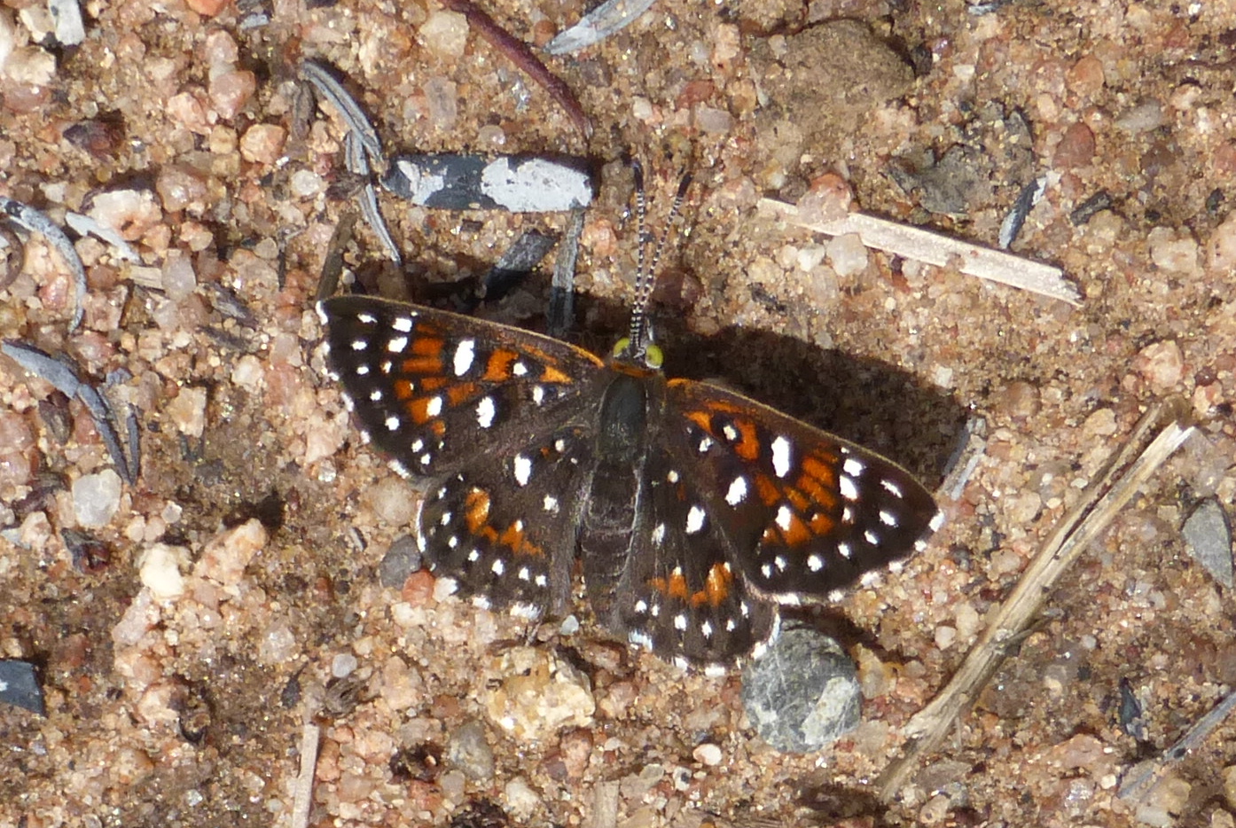 Observation notes: I'm still looking for the mormen metal mark, let me know when i find it. low sixties warmed to 65 by 1530 moist, creeks starting to trickle a little, there was 6 inches just up the road a little from this spot. the main drainage san juan creek has sediments on the banks. Chaparal sage scrub oaks and sycamores and some succulents very interesting area. this butterfly was warming on the ground. as it was cool. lots of buckwheat in the area. not sure of all the varieties but there are several. saw lots of butterflies getting nectar of the black sage. bramble or green hs. elfin , painted lady and two types at least of dusk's you will get some more photos oh yes there were more sonoran blues. but they were on filerie grass like plant low growing with purple flowers seeds look like little daggers