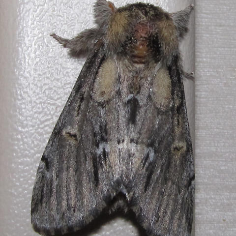 Observation notes: About 1 inch length, holds wings close like a prominent--gray with yellowish head, black and white marks on wings. Oval patches of grayish-yellow on back