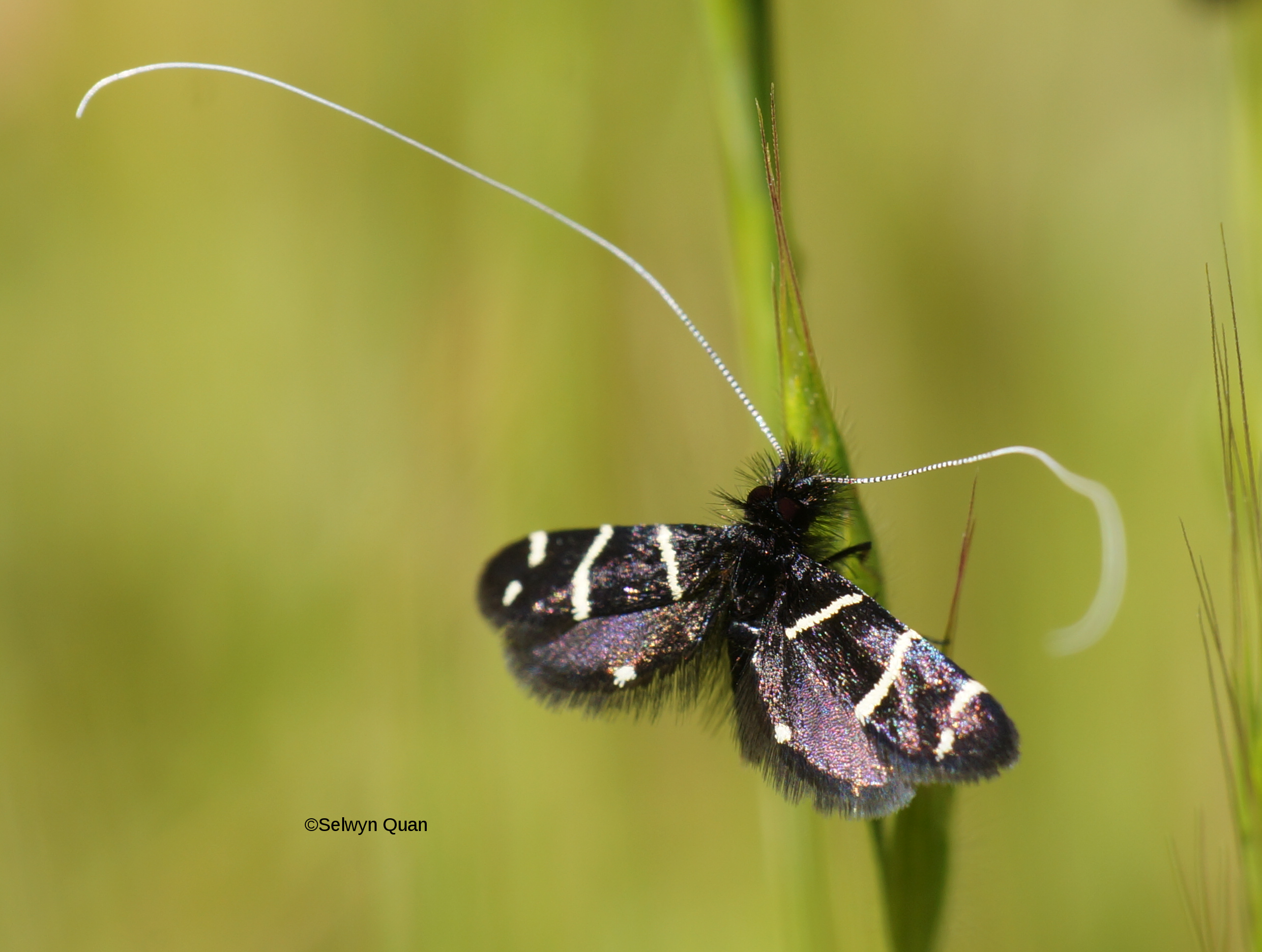 Identification: males have large eyes, long white antenna 3 times forewing length, black forewing crossed by three white lines which are reduced to two or only traces in some populations. Females have smaller eyes, smaller antenna (1.5 X FWL) and bright orange head. Forewing bright, metallic blue, hindwing purple