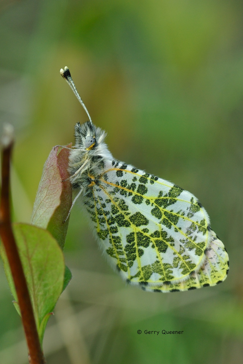 Identification: Upperside of male forewing with large, orange-red spot; border of apex dark, narrow. Female spot smaller; dark border with white wedges. Underside of hindwing with scattered, olive-green marbling. Some individuals are yellow.