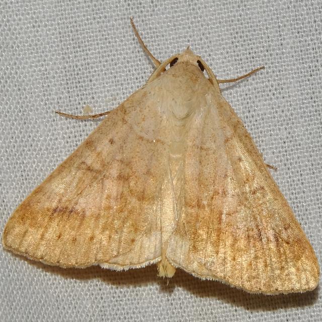 Identification: Forewing pale grayish brown in male, orangish yellow-brown in female. Lines fine, inconspicuous; lower pm. line bulges inward. Note diffuse dark patch beyond pm. line; it is darker in female than in male. Hindwing yellowish with two gray bands in both sexes.