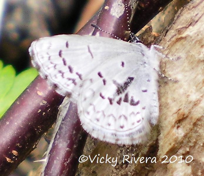 Identification: Seasonally variable and sexually dimorphic. Upperside of males blue, females with some black at outer edge of forewing. Late spring and summer forms with white above. Underside hindwing gray-white with faded small black dots, darker gray with larger black spots, or with blotches and black margins in the center.