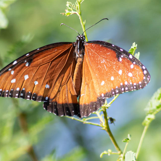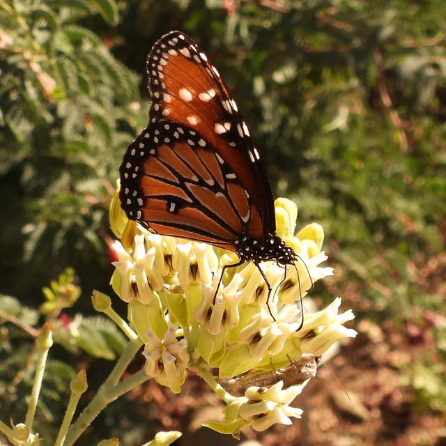 Identification: Upperside is chestnut brown; black borders of forewings have 2 rows of white spots; white spots are scattered at the forewing apex. Underside of hindwing has black veins; black borders of both wings have 2 rows of white spots. Upperside of male hindwing has a black scale patch. Very similar to the Soldier (Danaus eresimus), but is more brown and has less defined wing veins on the upperside. Underside hindwing lacks band of pale spots present in the Soldier. Queens in the southwest (and sometimes in the southeast) have pale veins on the upperside of the hindwings, which are lacking in the Soldier.