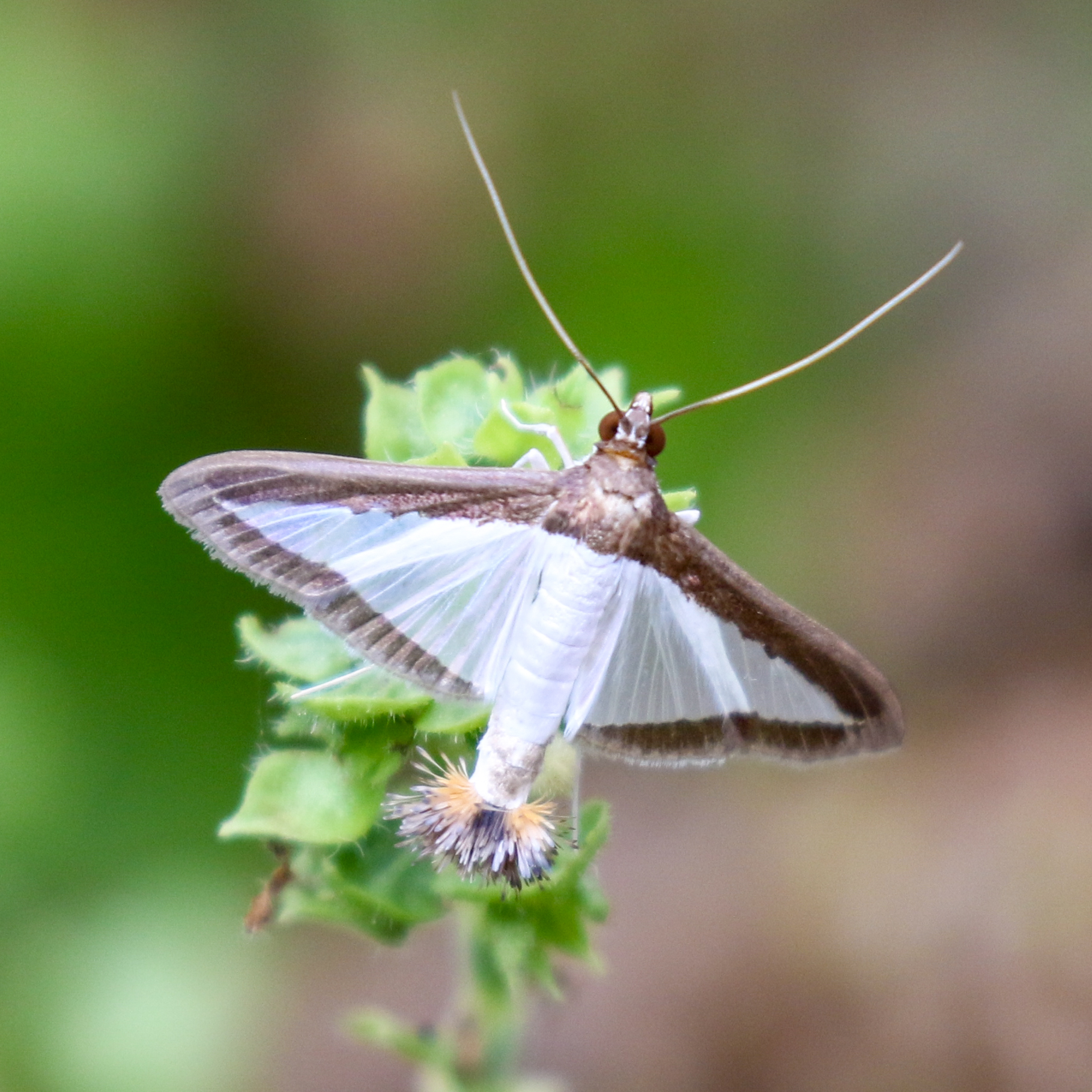 Identification: Wings pearly translucent white. Forewing has broad black costal border that continues on outer margins of all wings; black band also extends across thorax. Note anal tufts.