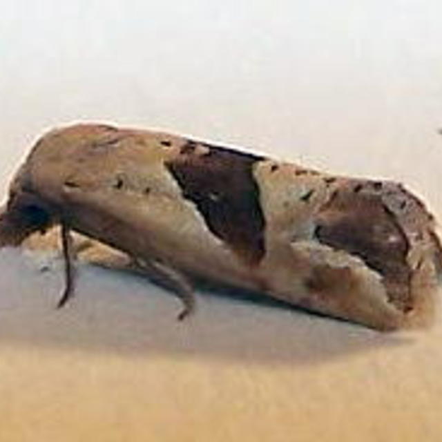 Identification: forewing light brown with two large dark brown patches in median and subterminal areas; median patch does not reach inner margin (creating two separate patches when wings held together at rest)