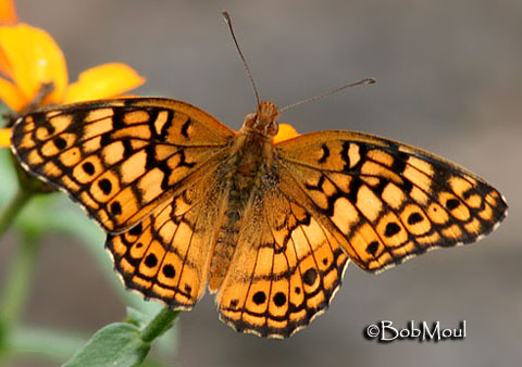 Identification: Upperside tawny orange with thick dark veins and markings; black spots near margin. Hindwing margin angled and slightly scalloped. Underside of hindwing with a mottled pattern and no silver spots.