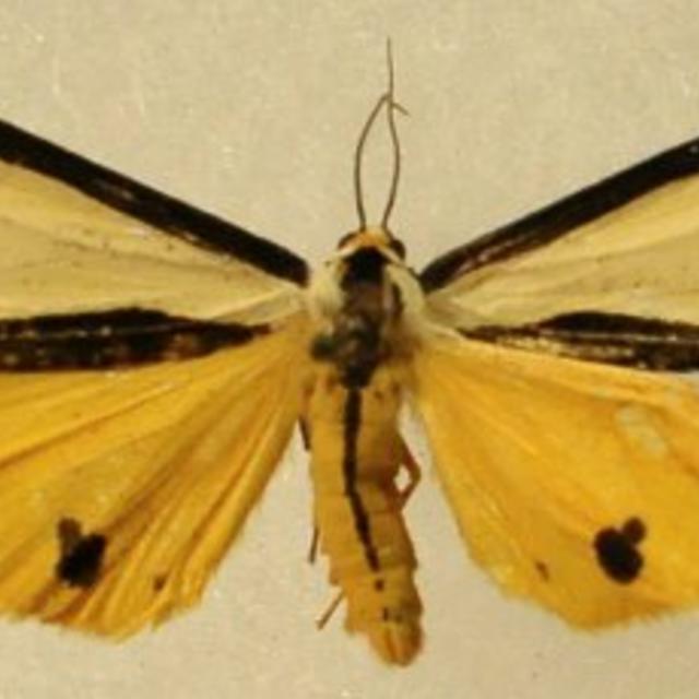 Identification: Boldly patterned forewing and orange-yellow hindwing. Forewing is cream-colored with a partial dark brown border that extends inward as a spur from inner margin near anal angle. Hindwing has 1-2 dark brown spots near anal angle.