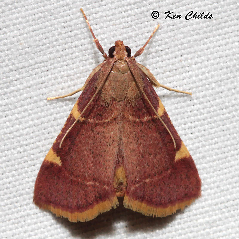 Identification: Similar to Hypsopygia costalis, but slightly larger. Ground color varies from rose to deep purplish. Widened tops of am. and pm. lines more triangular. Yellow fringes on all wings, but narrower.