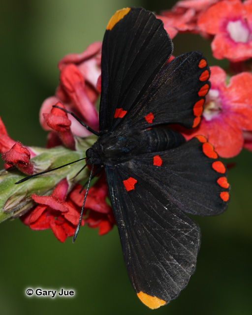Identification: Upperside black. Tip of forewing yellow-orange; base of wing with red spot. Hindwing outer margin with band of red spots.