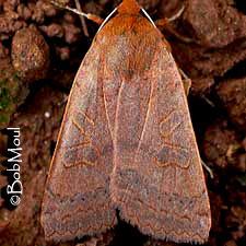Identification: Forewing bright chestnut; median area sometimes slightly paler. Am. and pm. lines purple, scalloped; pm. line scallops darkest, at sharp points. Purple shading over am. and pm. lines and in median and st. areas. Spots faint, darker brown; purple in lower end of reniform spot blends into broad median shade line. Hindwing dark grayish brown with chestnut fringe.