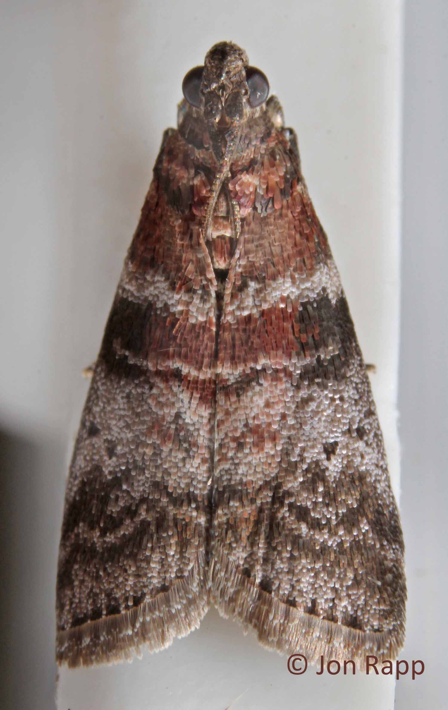 Identification: Forewing a mix of pale gray, dull reddish-brown, and dark gray to blackish bands; double dark discal spot in median area; terminal line a series of dark dashes; fringe pale gray; hindwing light brownish-gray with pale gray fringe
