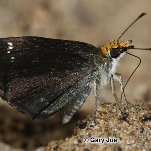 Identification: Uppersides of head and palpi are orange. Wings are sooty black; forewing has very small, translucent white spots near the apex. Margins of hindwing are barely scalloped.