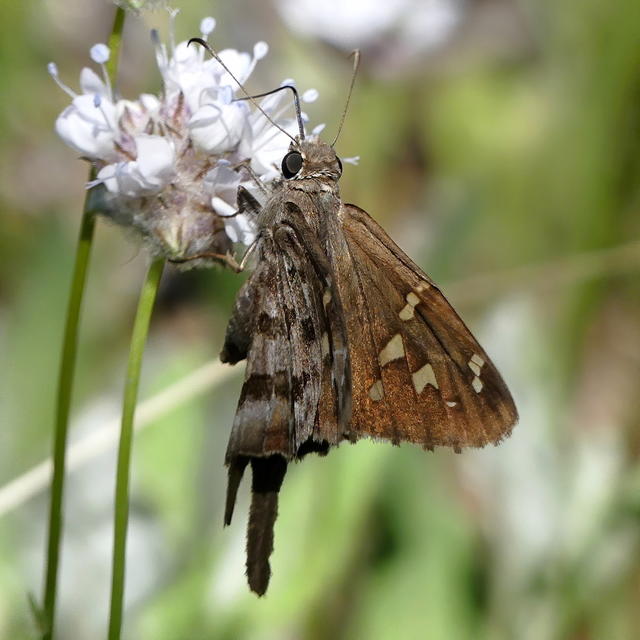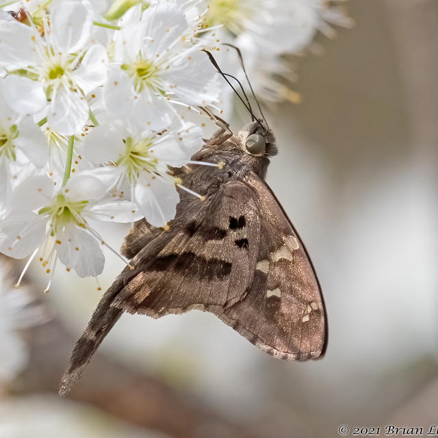 Identification: Tails are long; fringes checkered. Body and wings are brown with no green iridescence. Forewing has prominent clear spots. Underside of hindwing has 2 bands of pale spots.